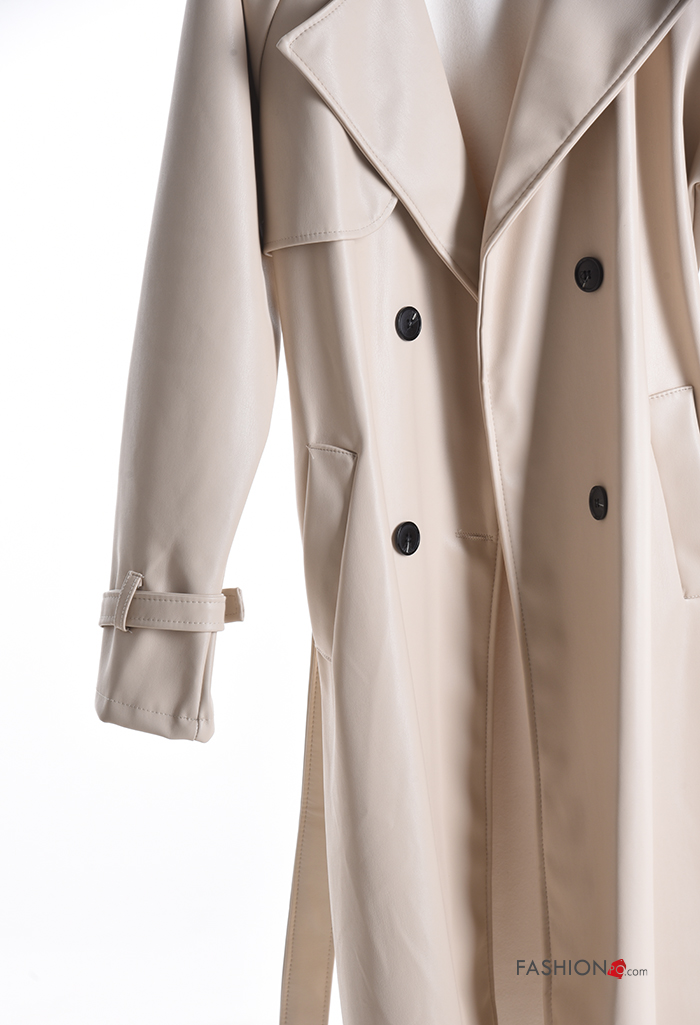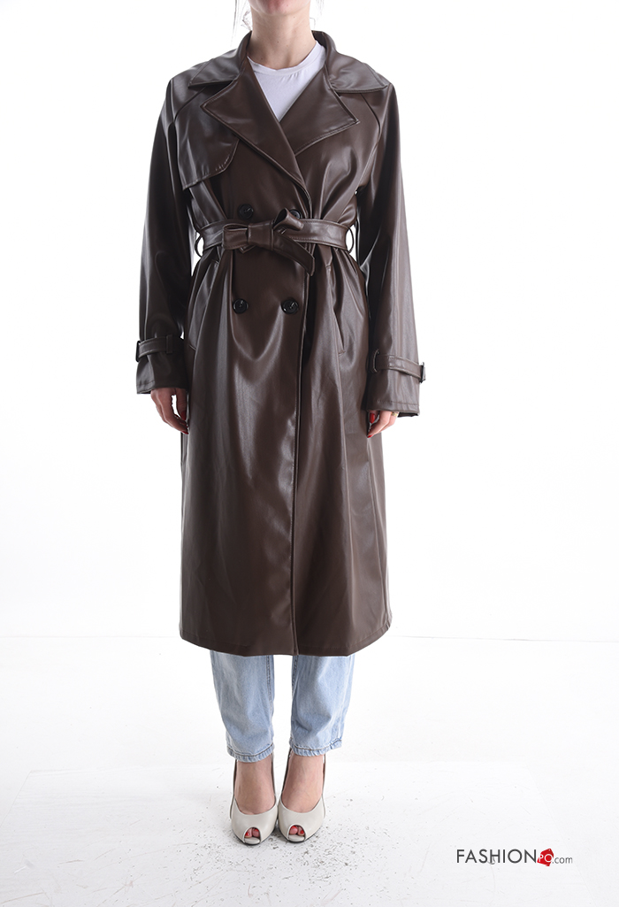 Imperméable faux cuir manches longues avec ceinture à boutons