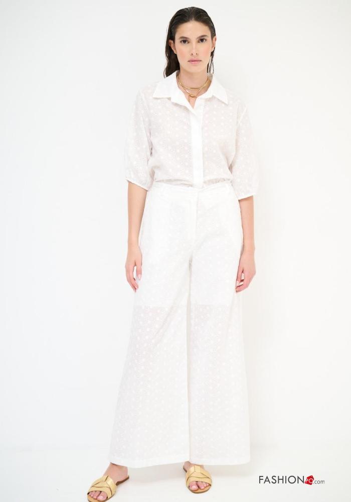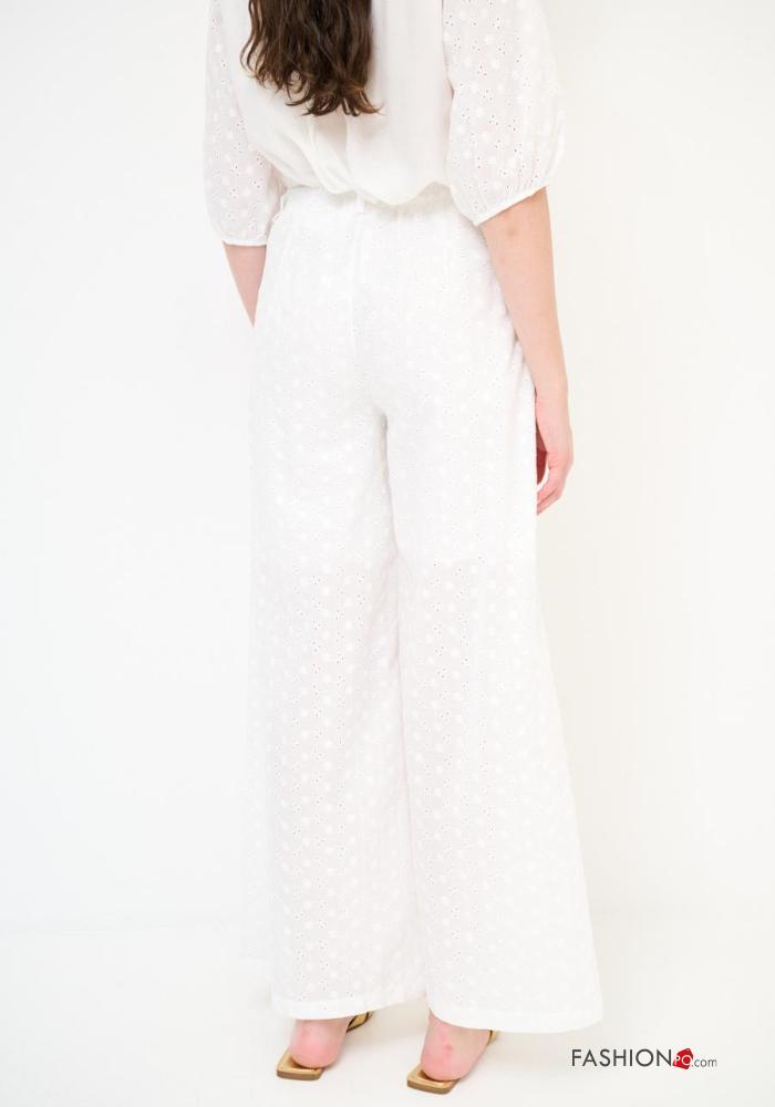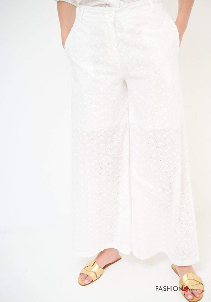 Pantalon en Coton wide leg à broderie avec poches à boutons broderie anglaise avec fermeture éclair