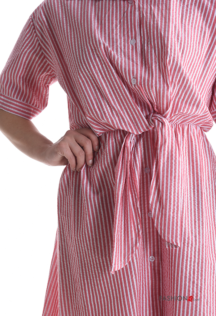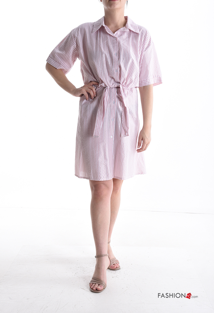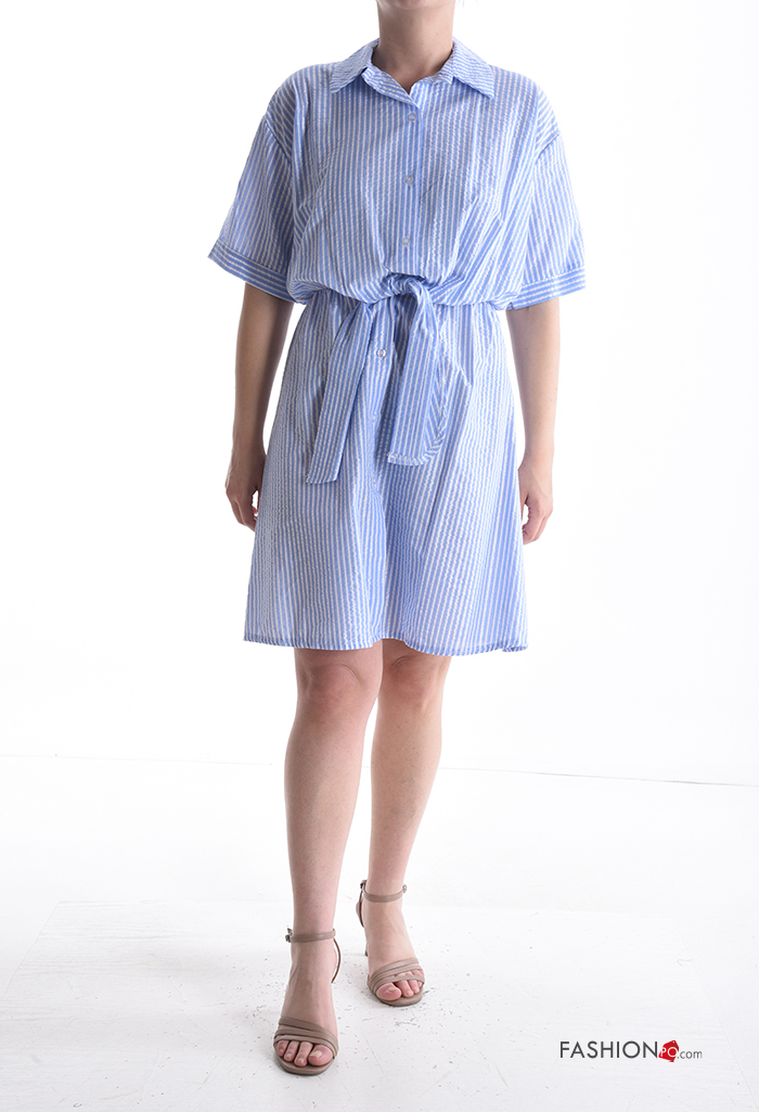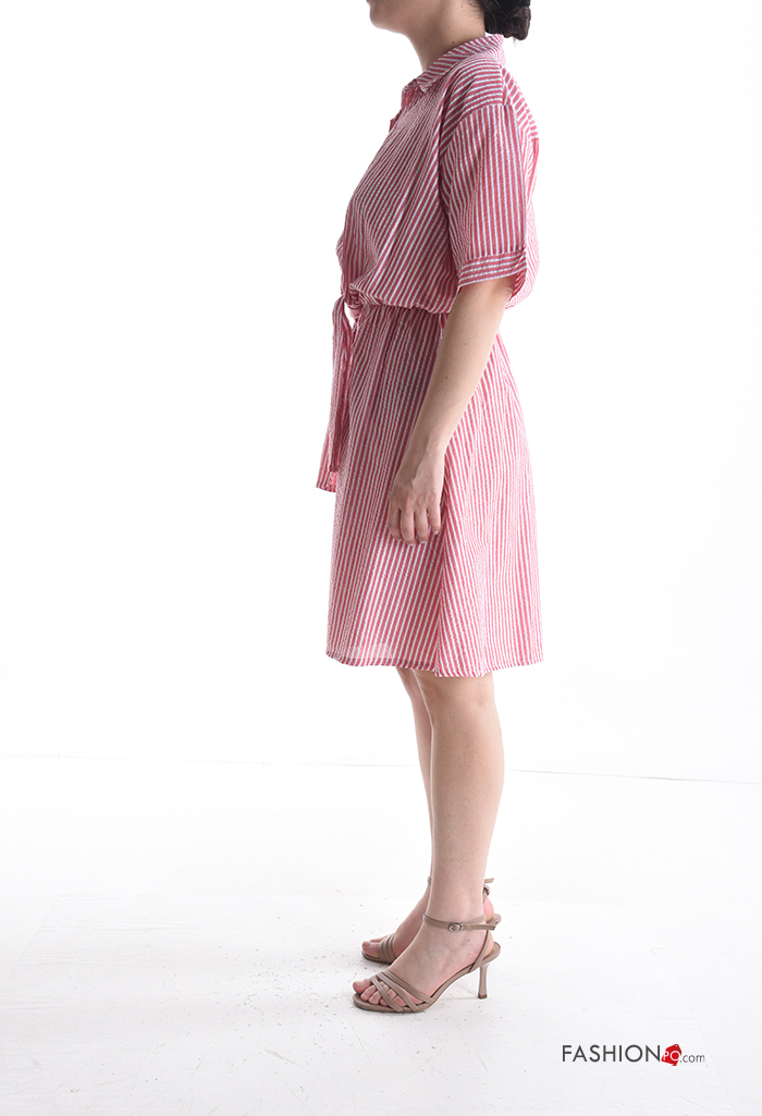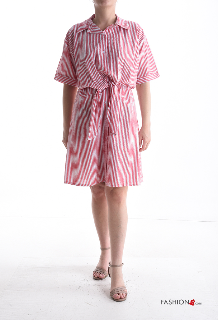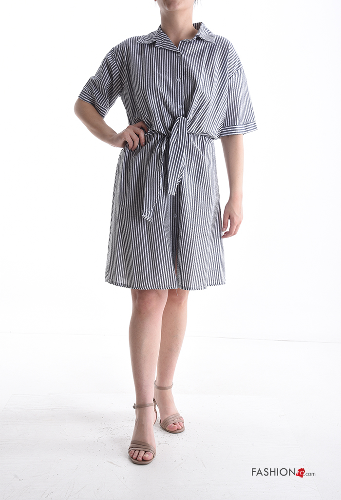Robe en Coton à genoux à collet manches courtes Imprimé à rayures à boutons à noeud