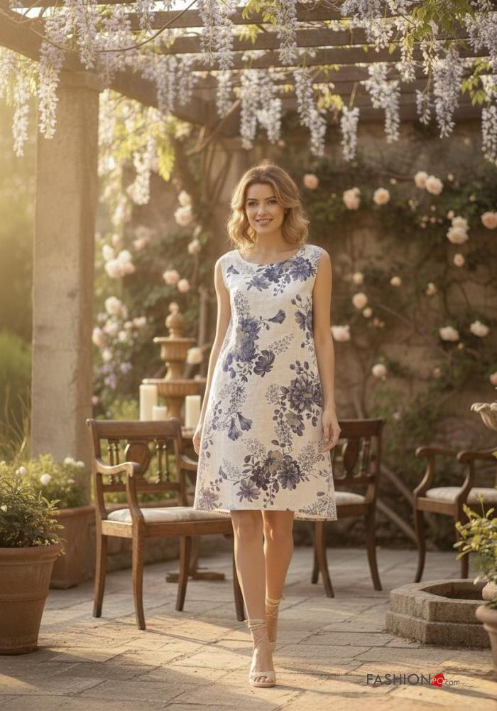 Robe en Lin à genoux col rond manches courtes à Imprimé Floral avec poches