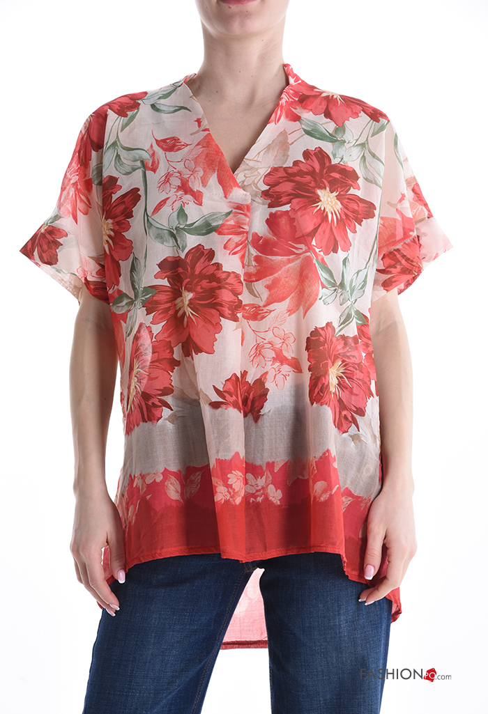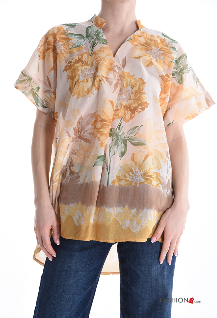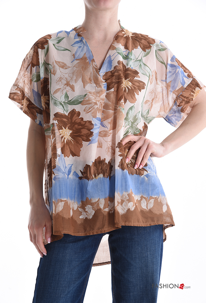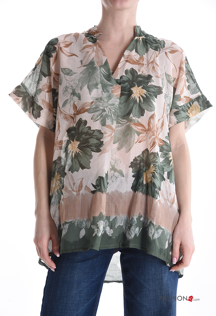 Blusa in Cotone maniche corte Fantasia floreale scollo a V
