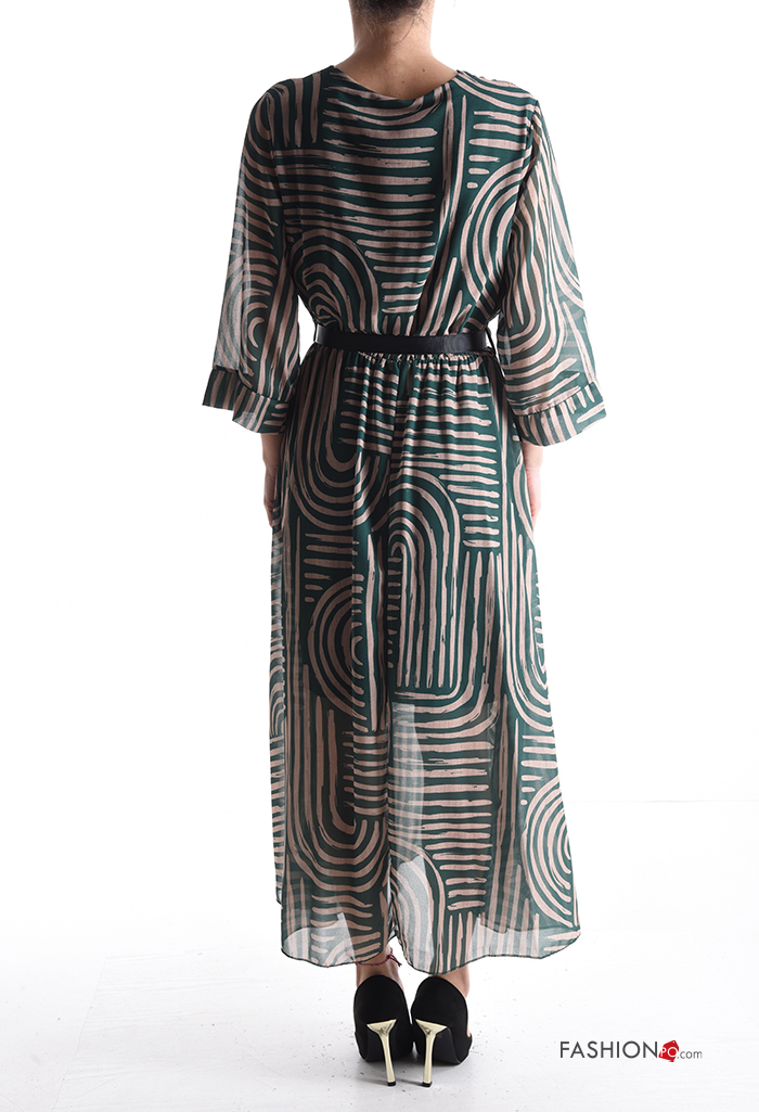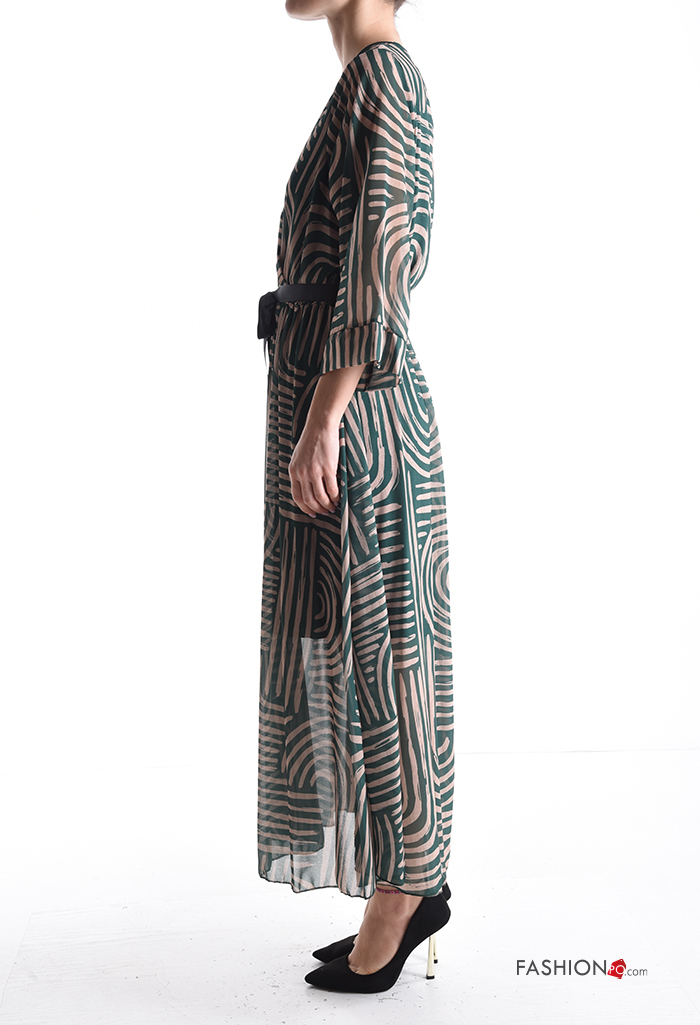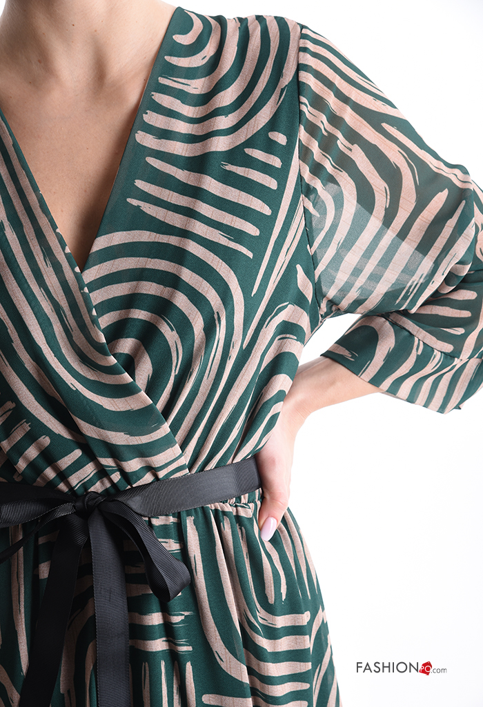 Abito chiffon Fantasia astratta maniche a tre quarti con cintura in stoffa scollo a V con fodera