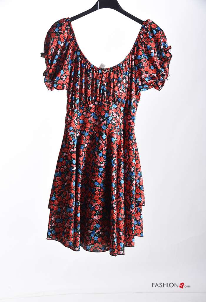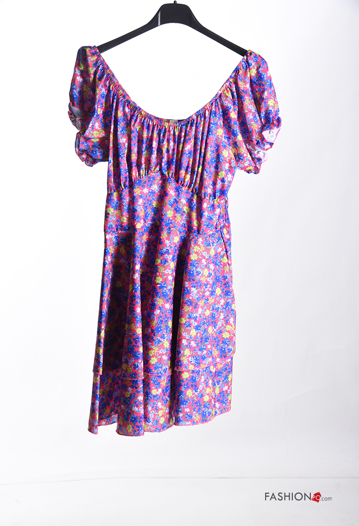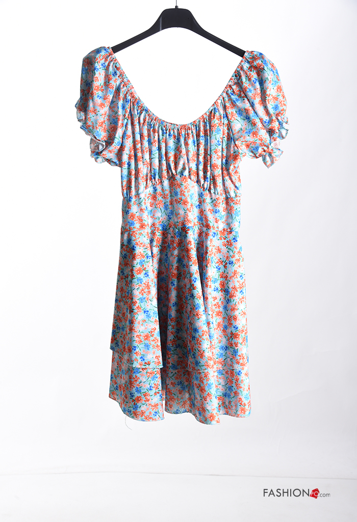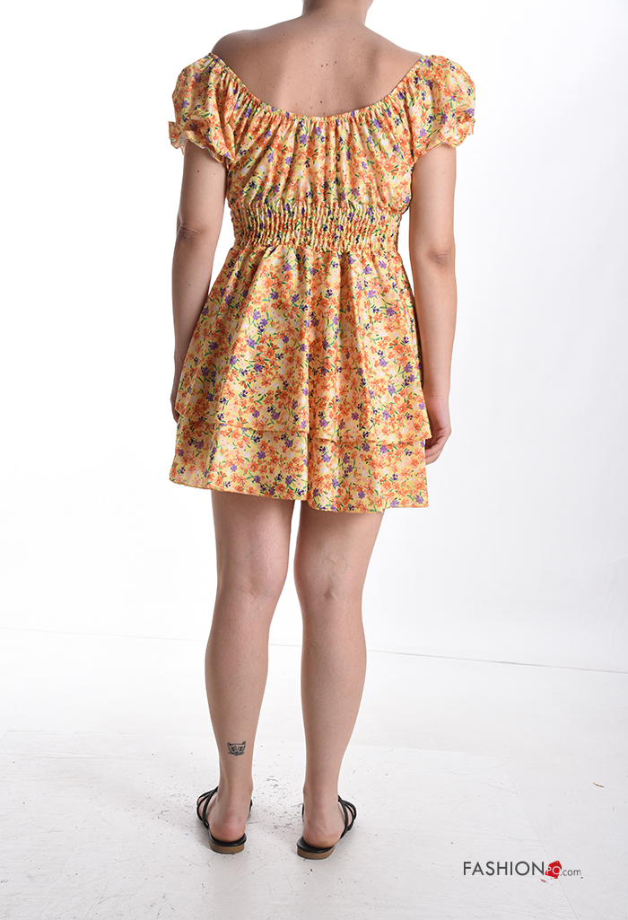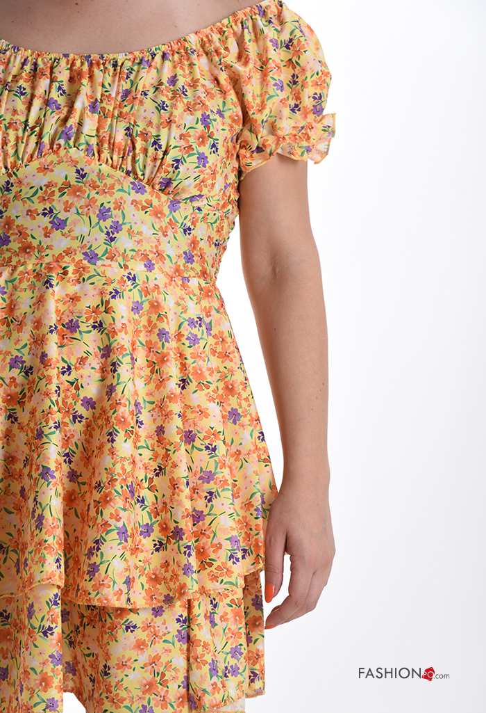 Abito maniche corte corto Fantasia floreale scollo alla bardot con balze con elastico
