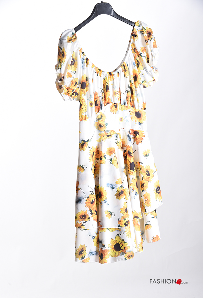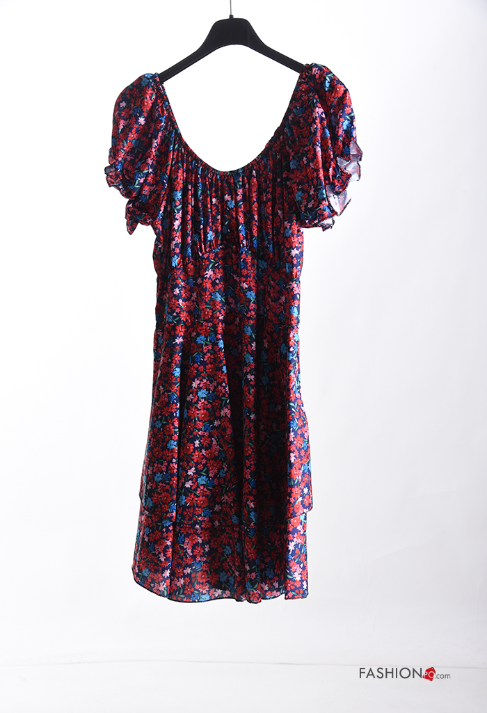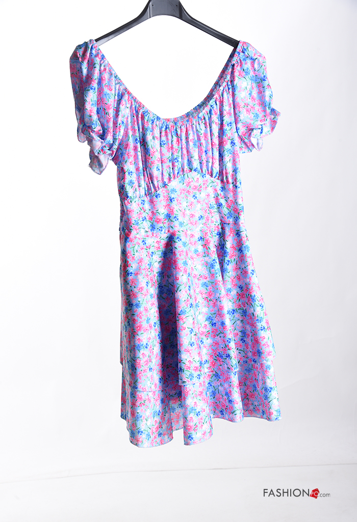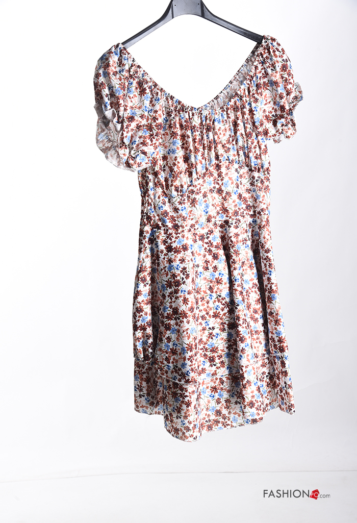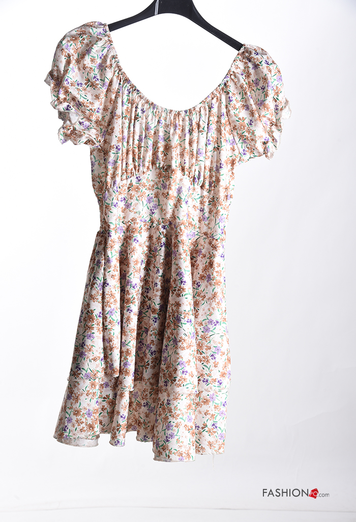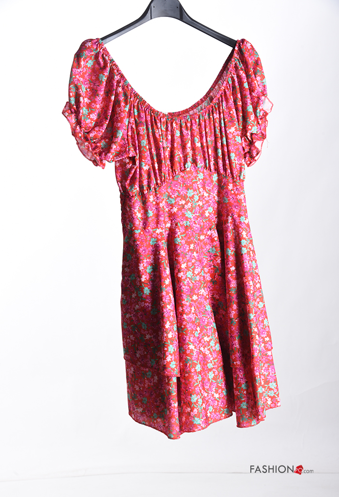 Abito maniche corte corto Fantasia floreale scollo alla bardot con balze con elastico
