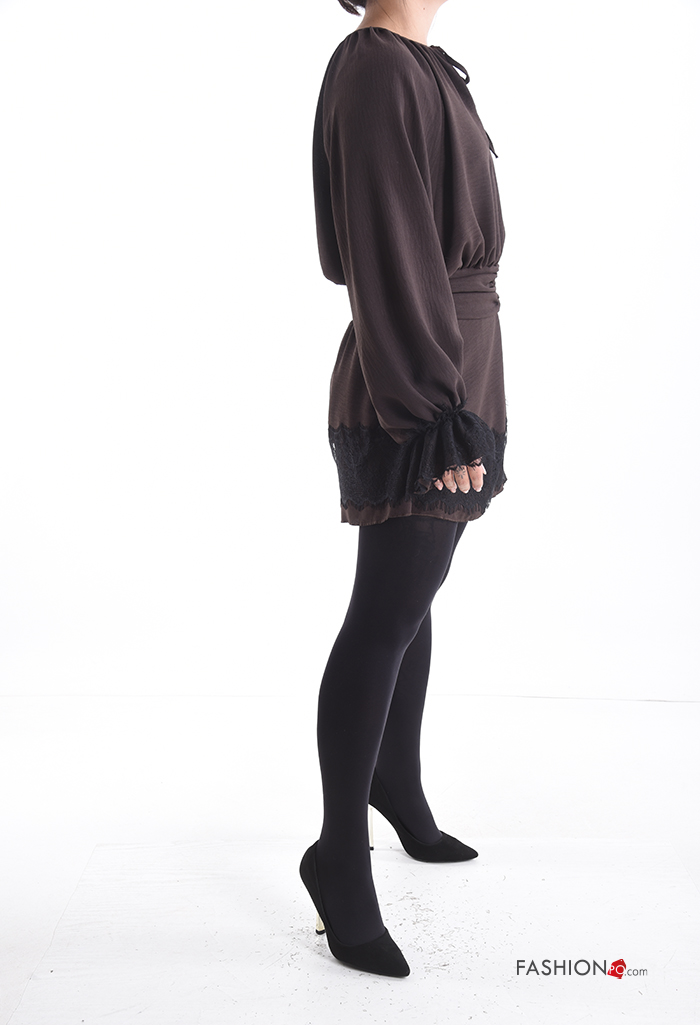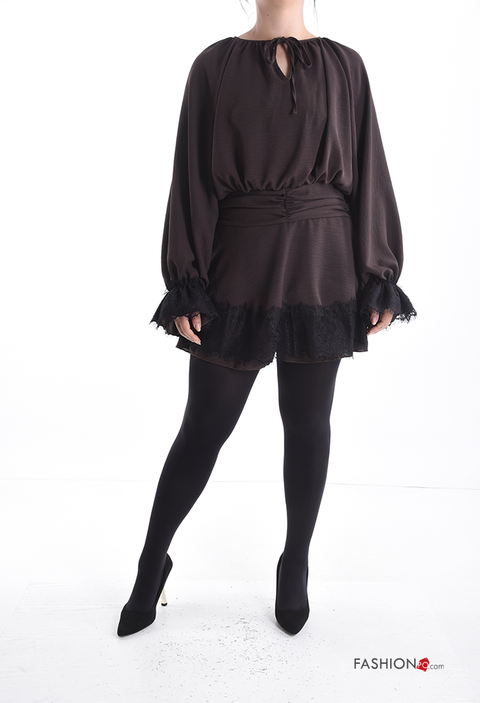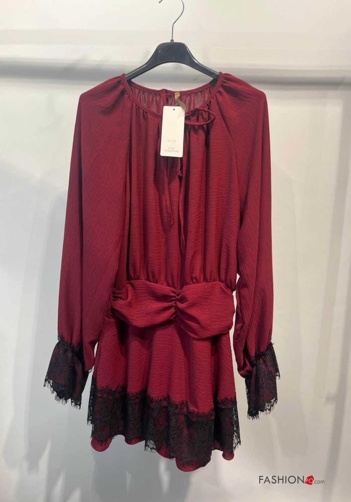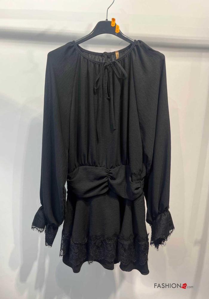 Abito girocollo corto maniche a palloncino pizzo maniche lunghe con fiocco con elastico