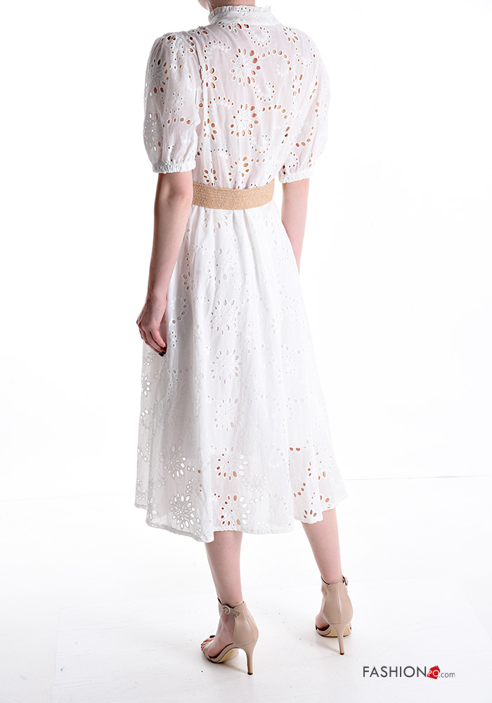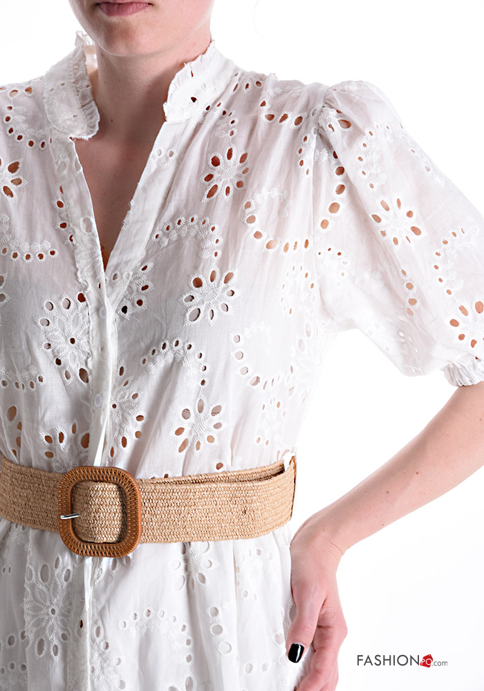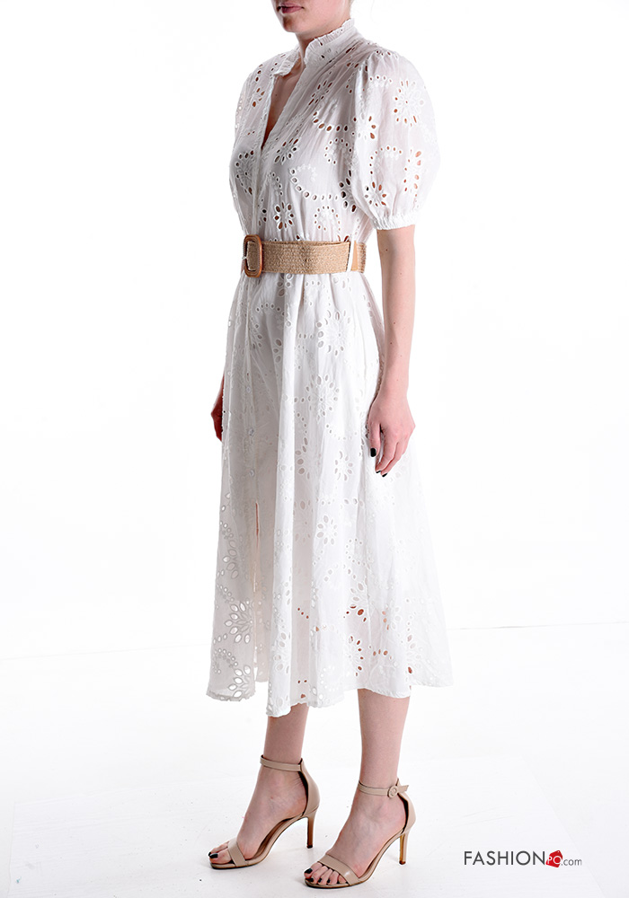 Abito chemisier in Cotone maniche corte lungo in pizzo sangallo scollo a V con cintura con tasche