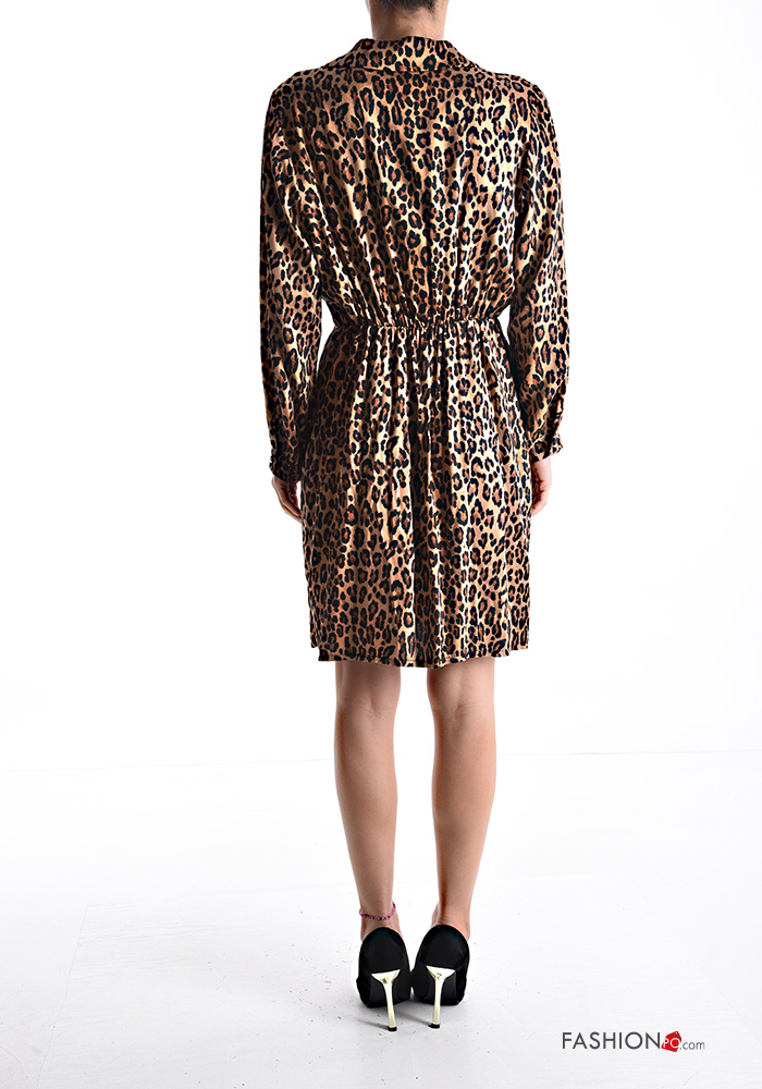 Abito al ginocchio maniche lunghe con colletto Fantasia animalier scollo a V con elastico