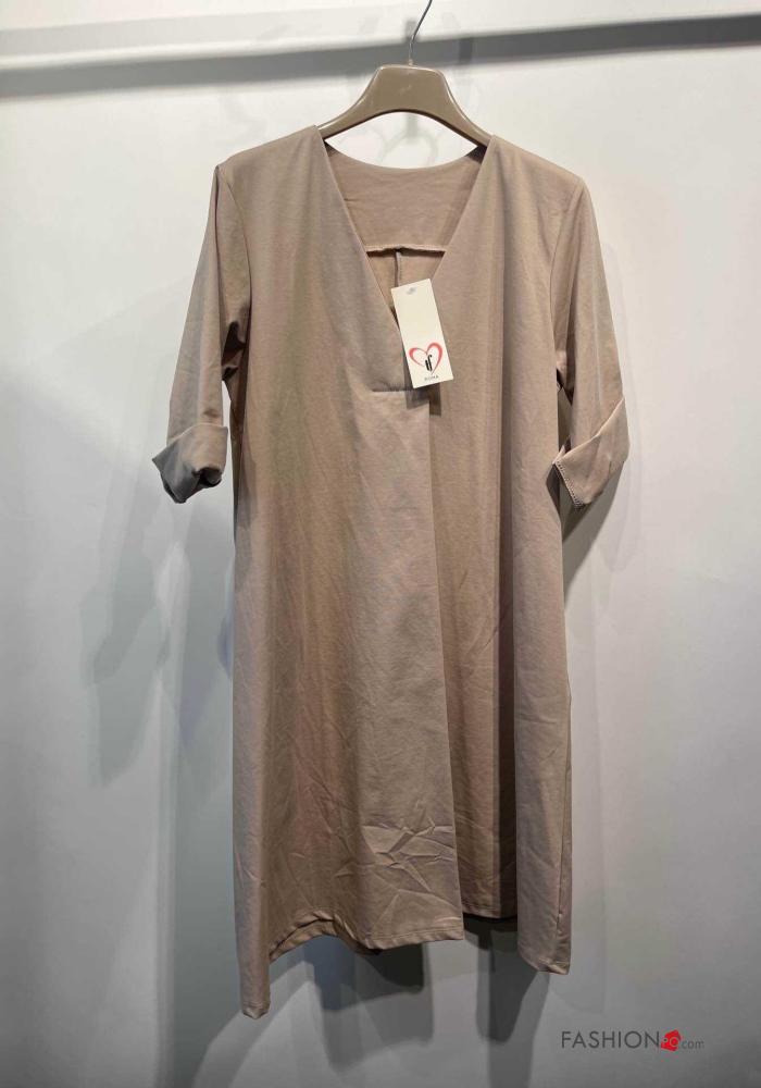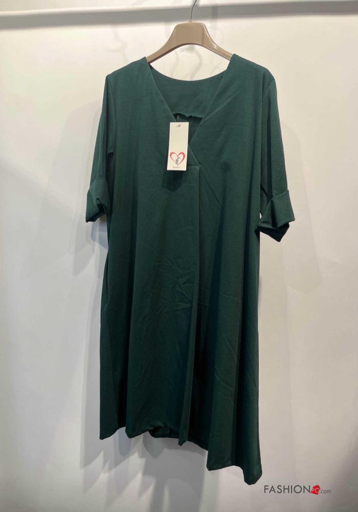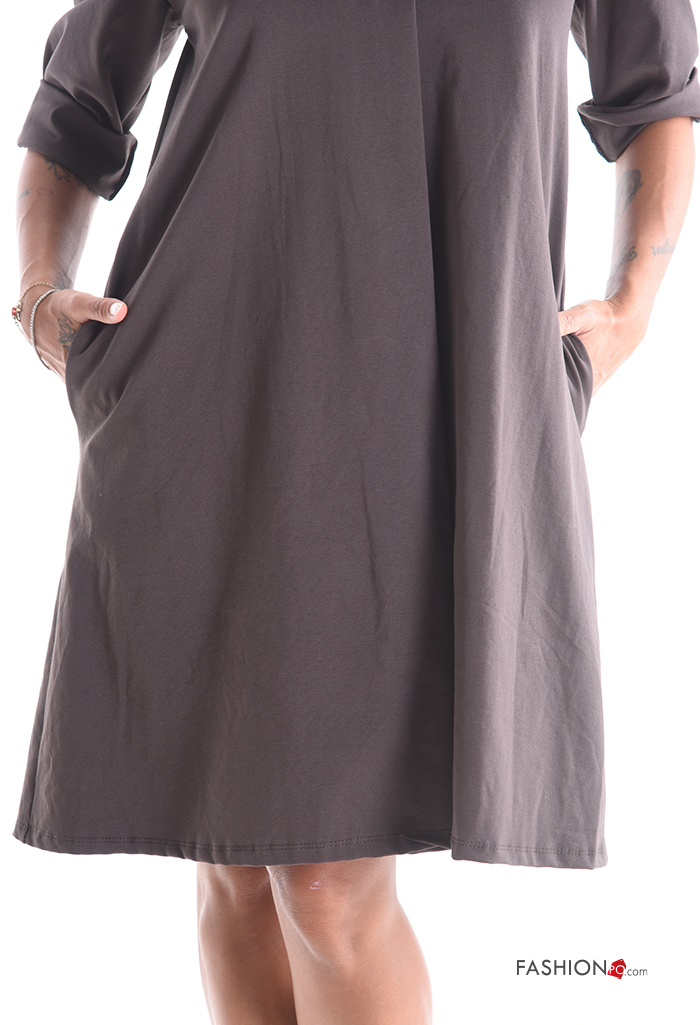 Abito in Cotone maniche lunghe al ginocchio con tasche scollo a V