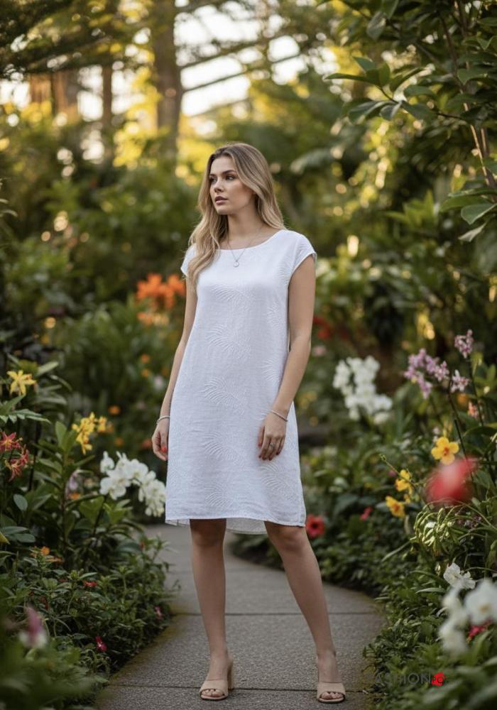 Abito in Lino al ginocchio maniche corte girocollo Fantasia ricamata