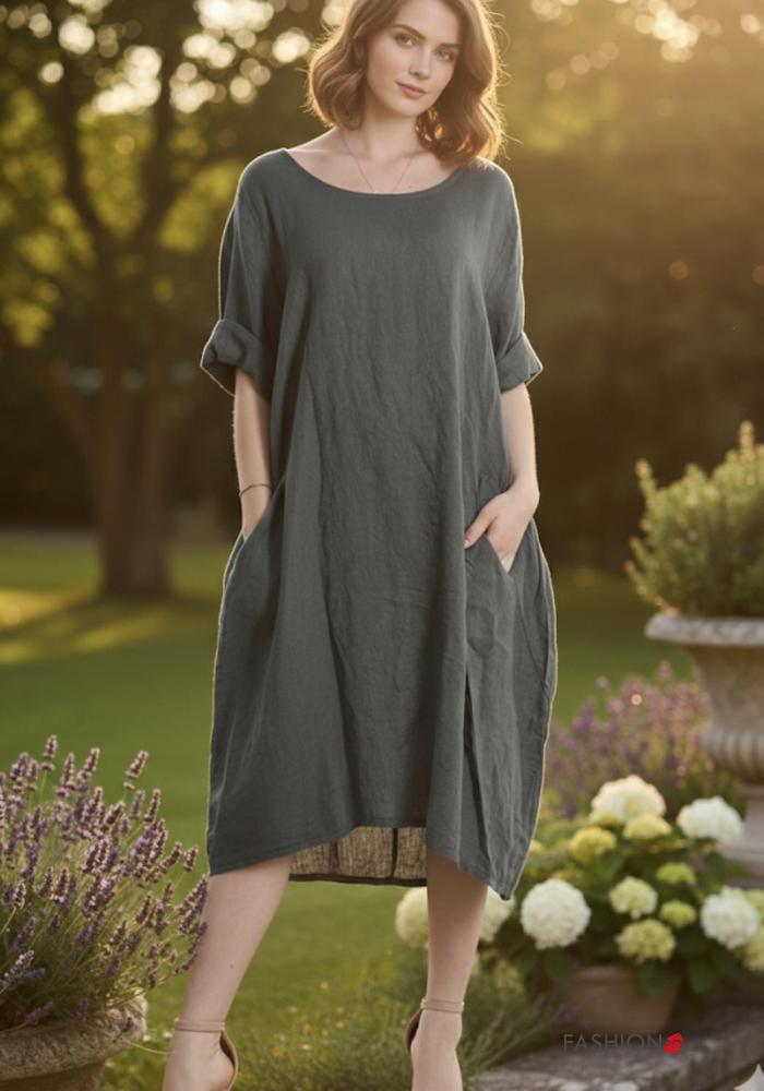 Abito in Lino oversize girocollo con tasche maniche a tre quarti