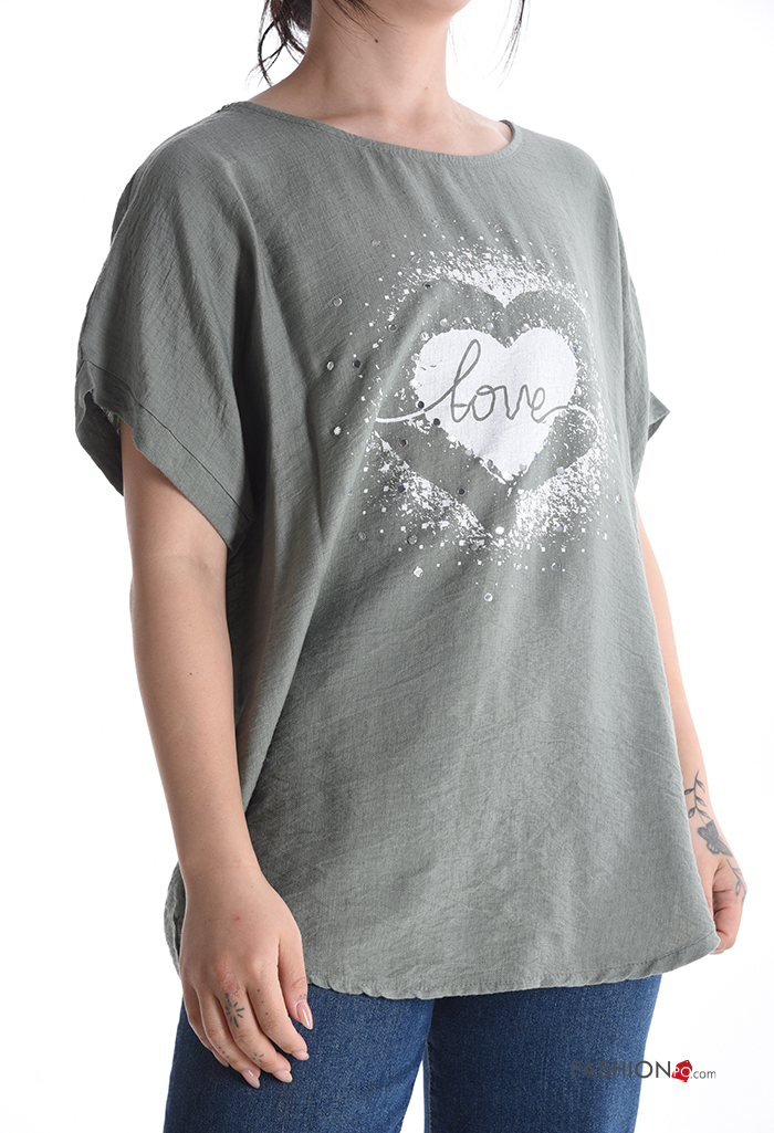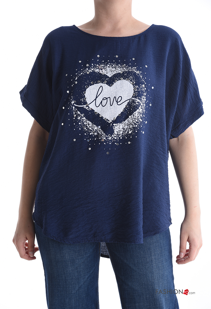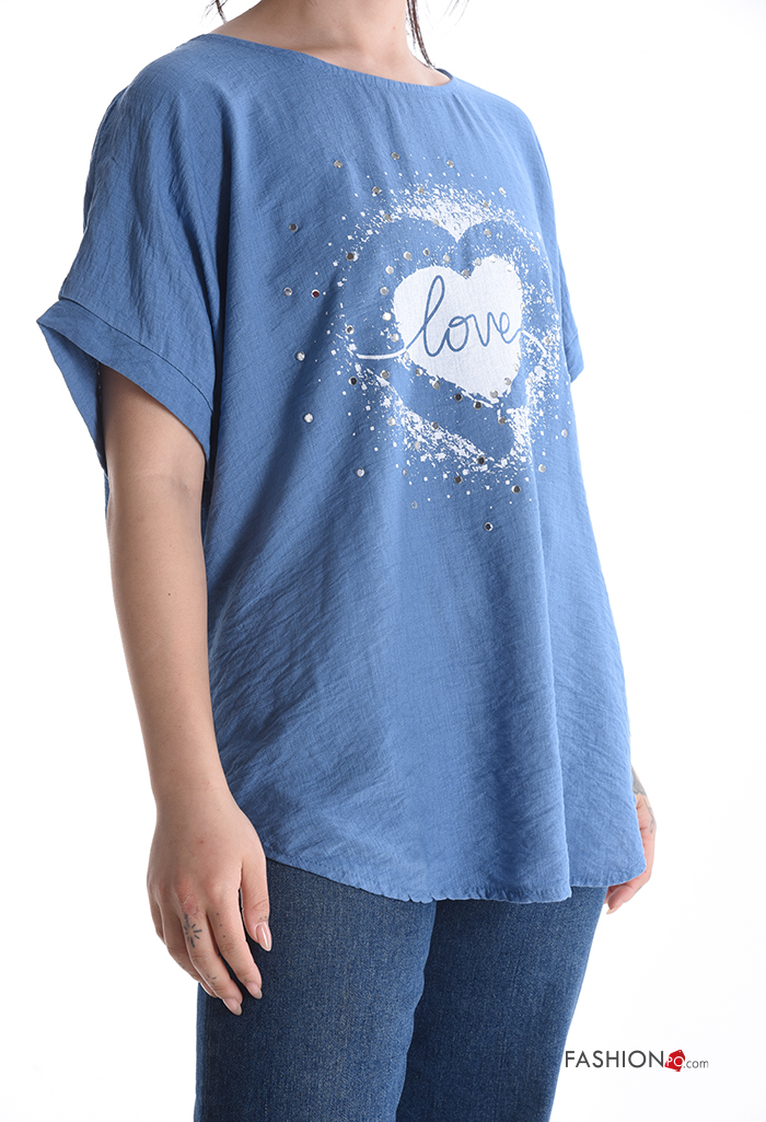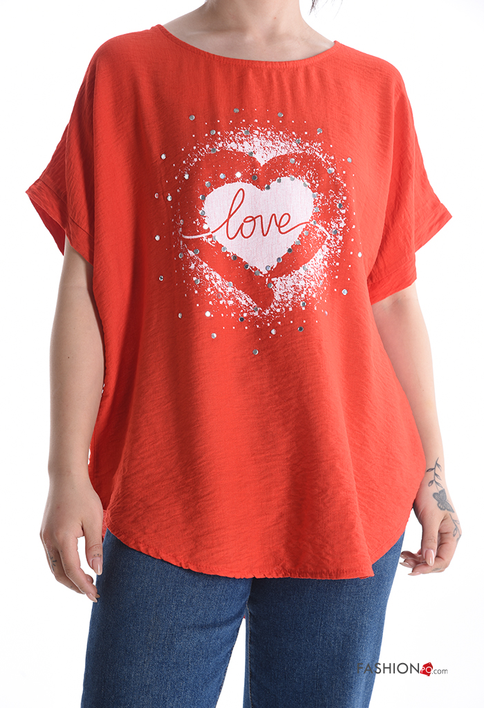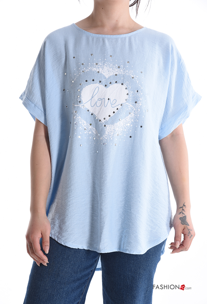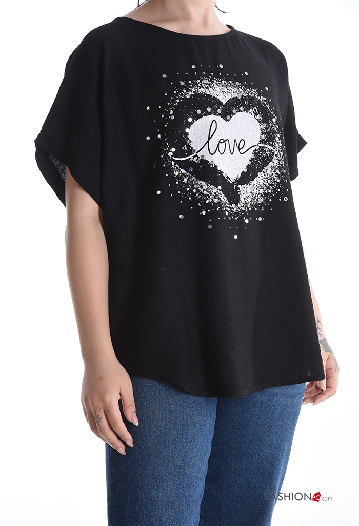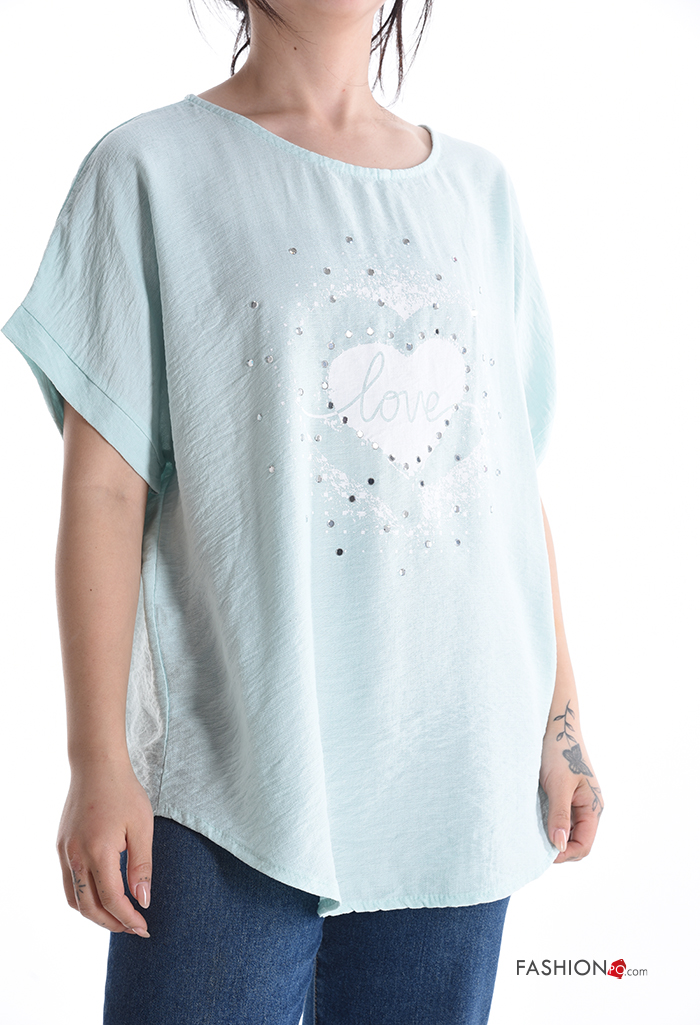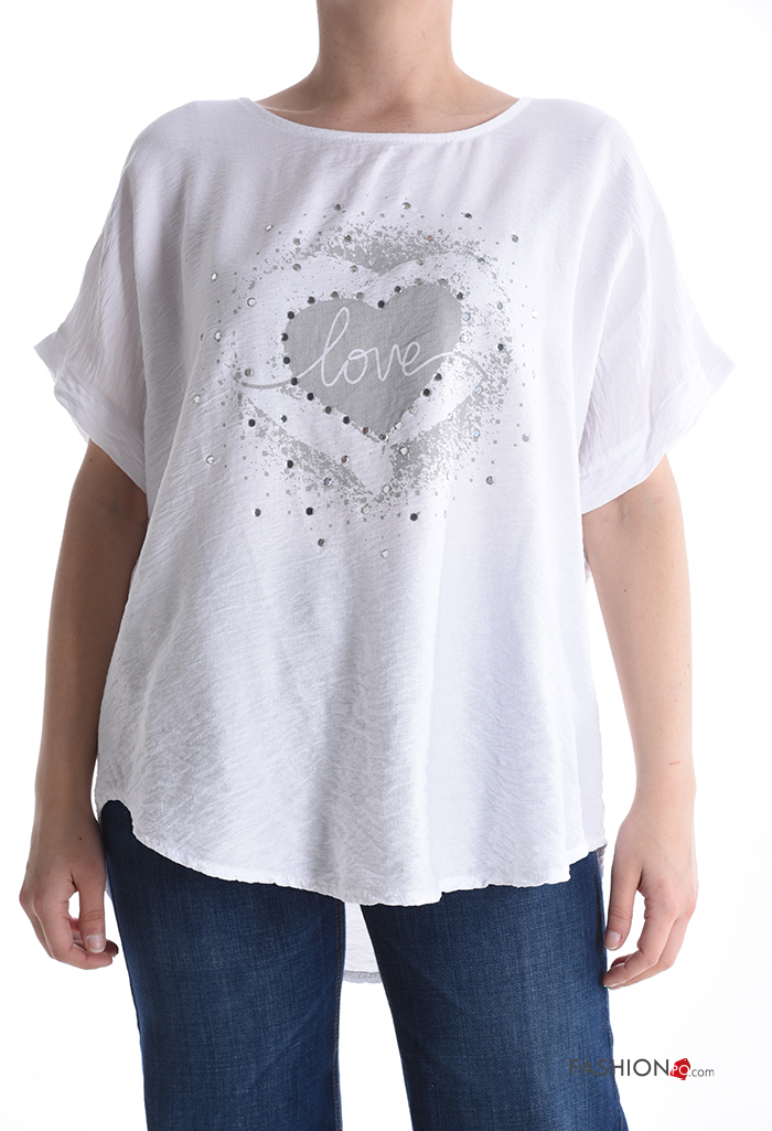 Blusa maniche corte girocollo Fantasia cuore con strass