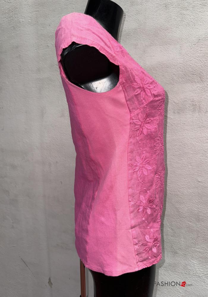 Blusa in Lino maniche corte girocollo Fantasia ricamata