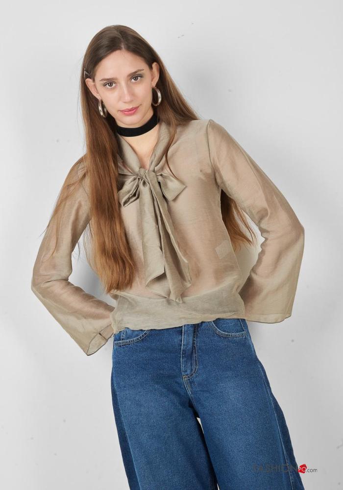 Blusa in Lino maniche lunghe con fiocco scollo a V