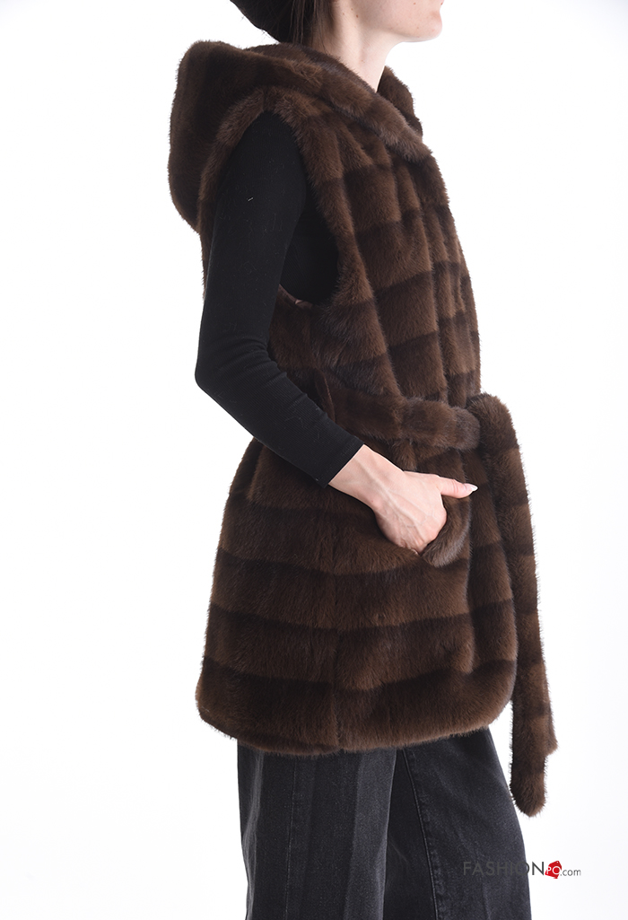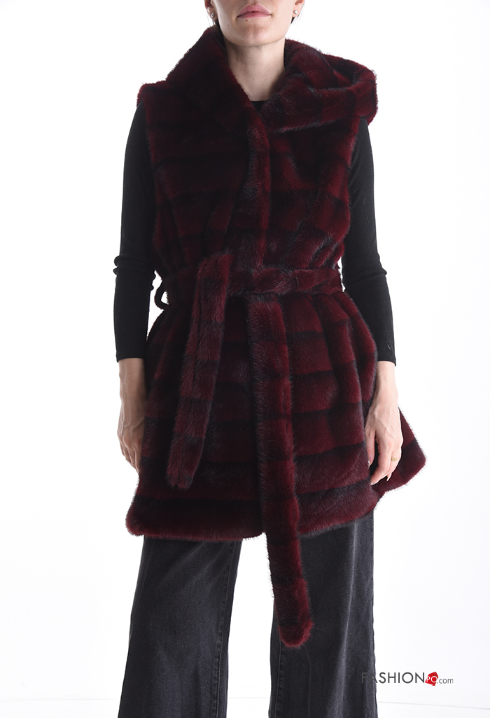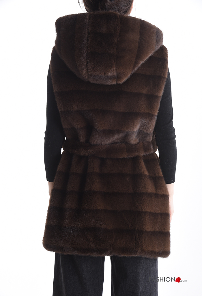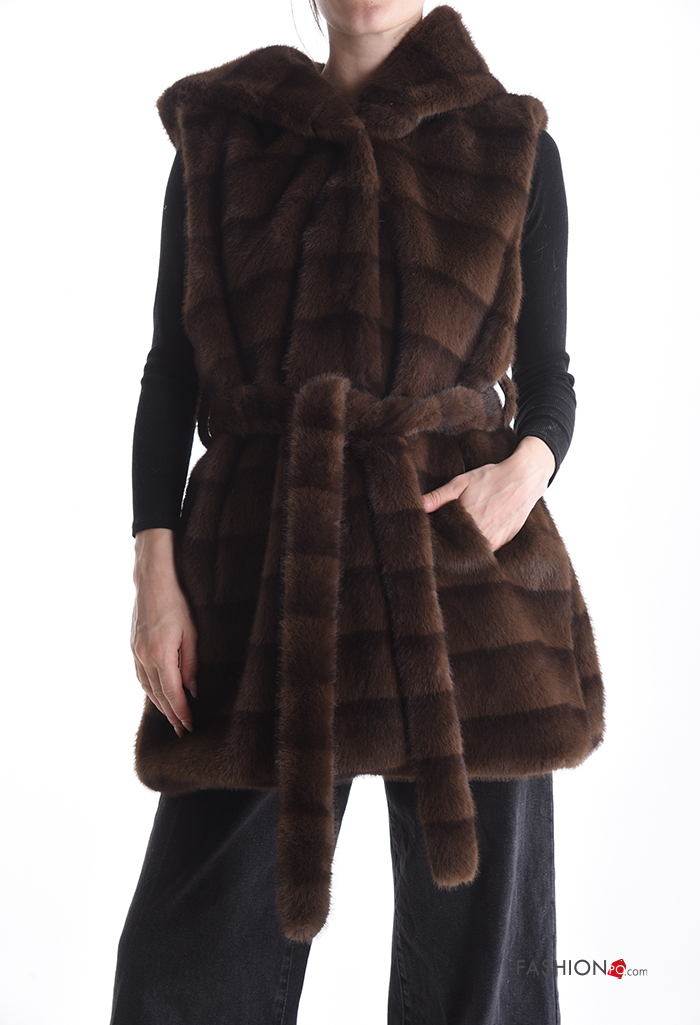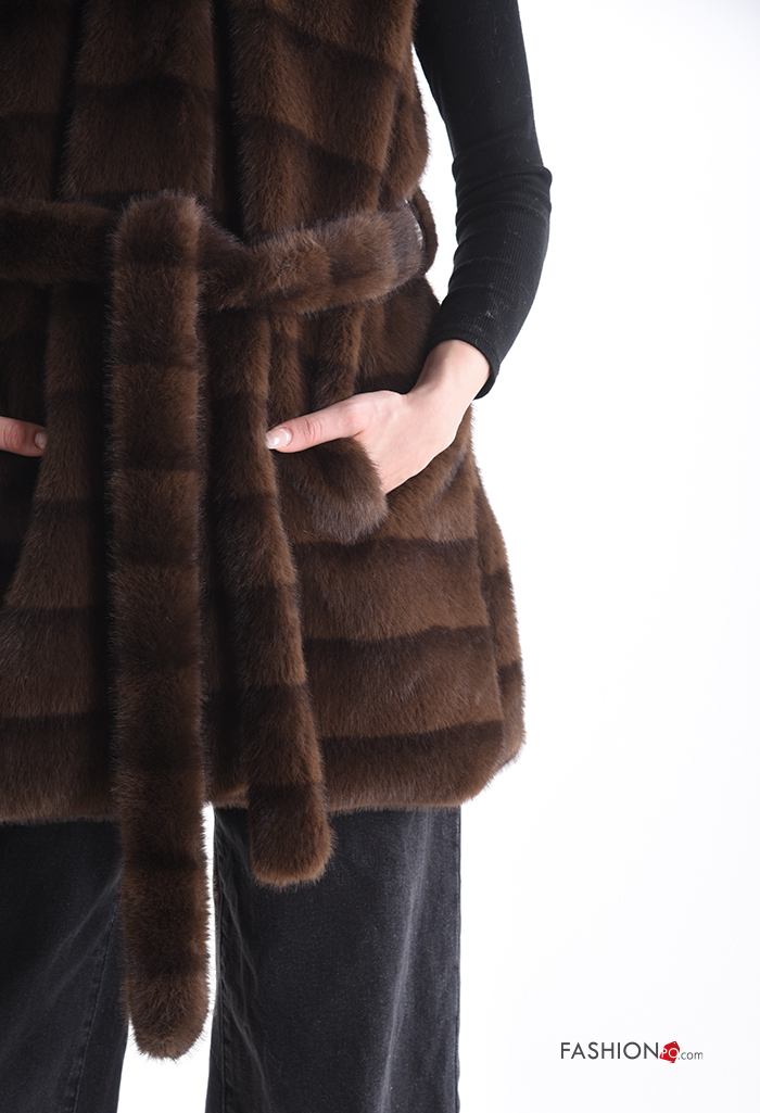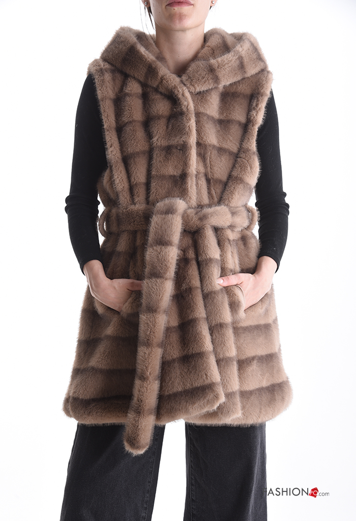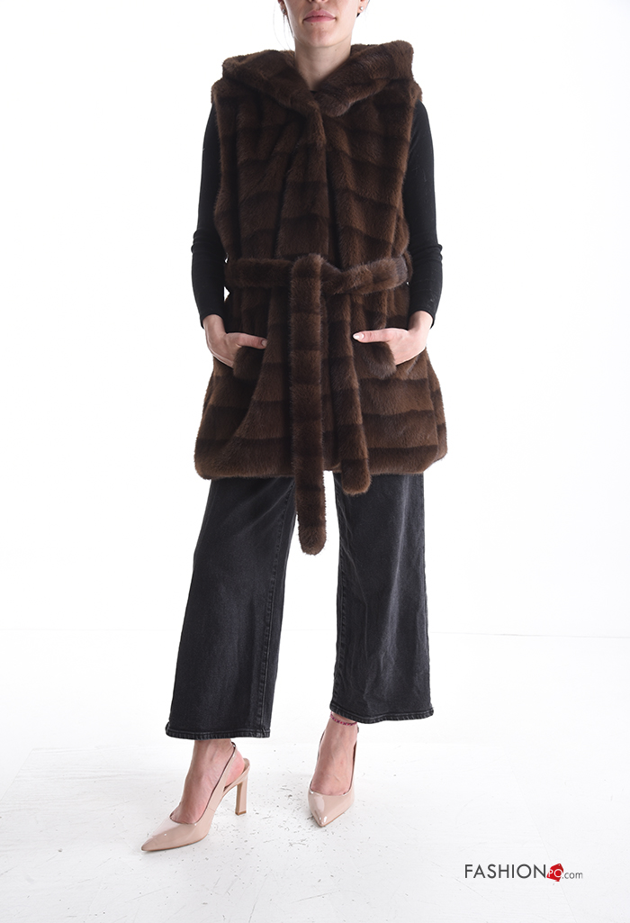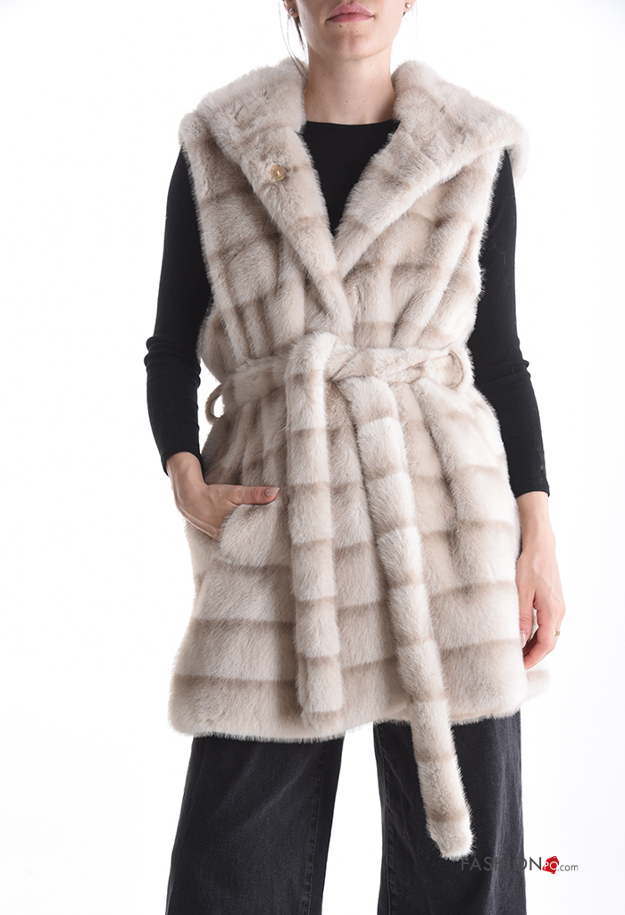 Smanicato pelliccia sintetica con fodera con cappuccio con cintura con bottoni