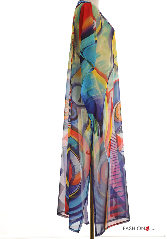 Copricostume chiffon maniche corte lungo Fantasia artistica scollo a V con spacco