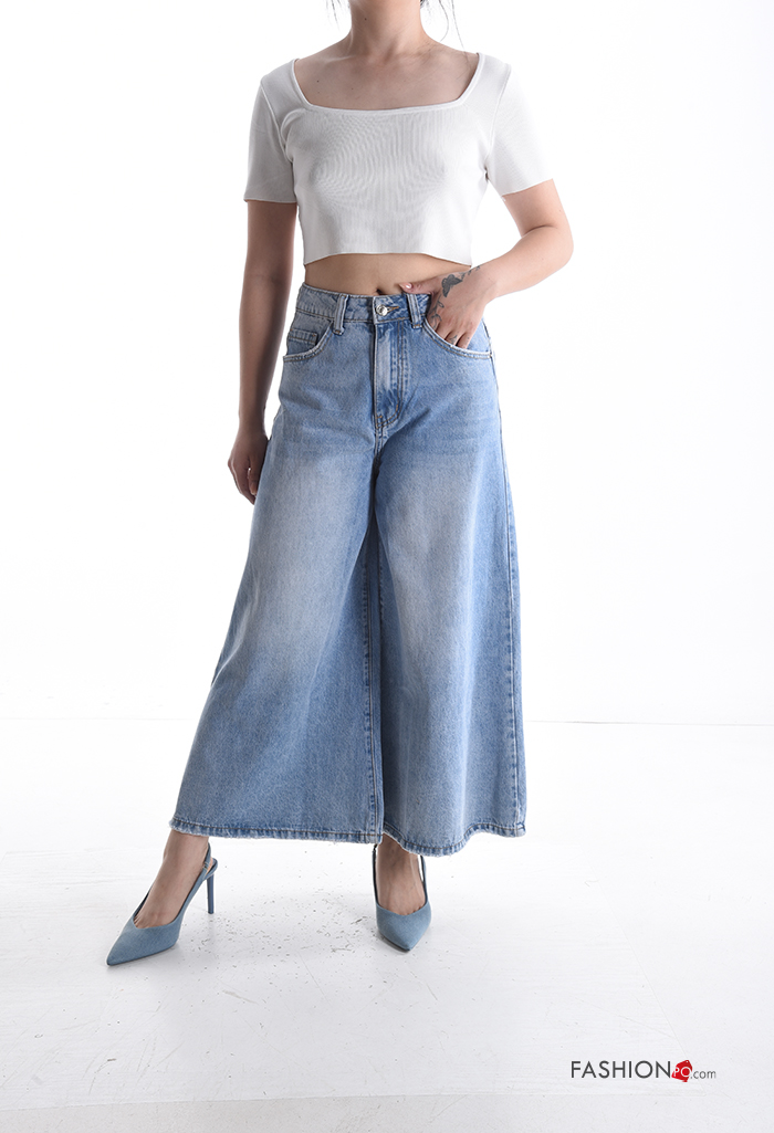 Jeans in Cotone denim wide leg con tasche con bottoni con zip