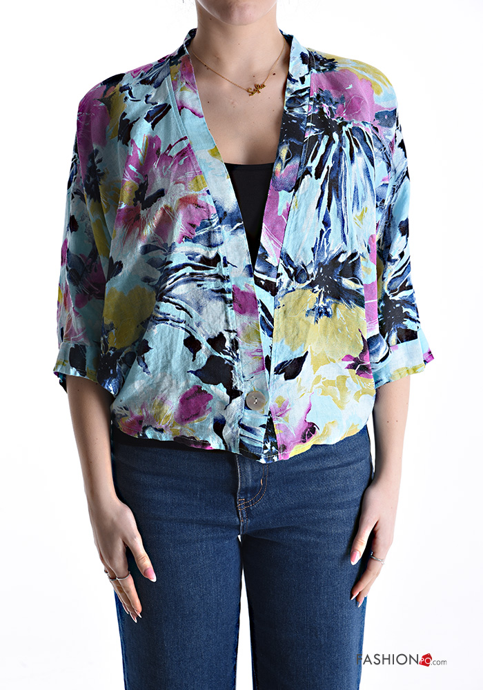 Cardigan in Lino Fantasia floreale con bottoni maniche a tre quarti
