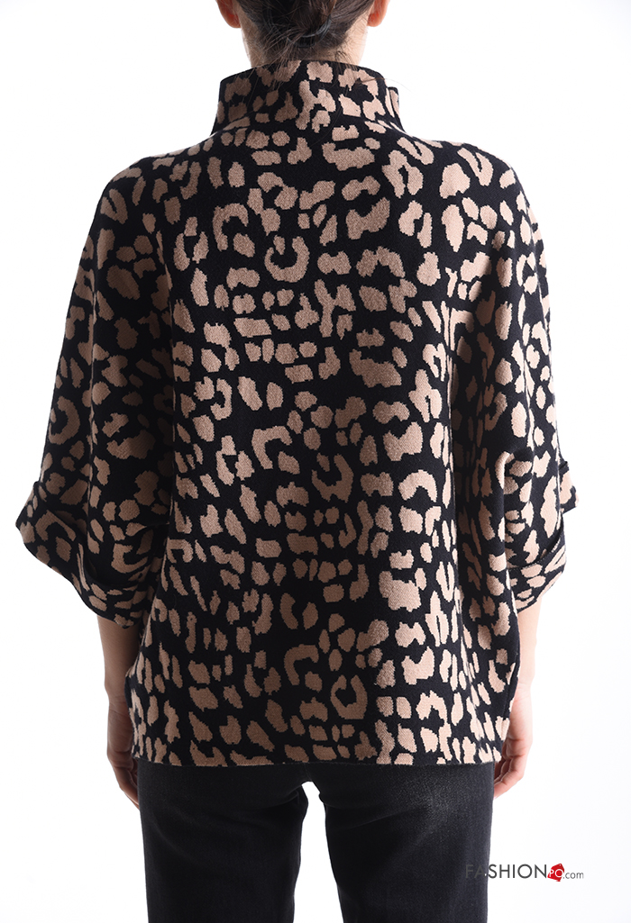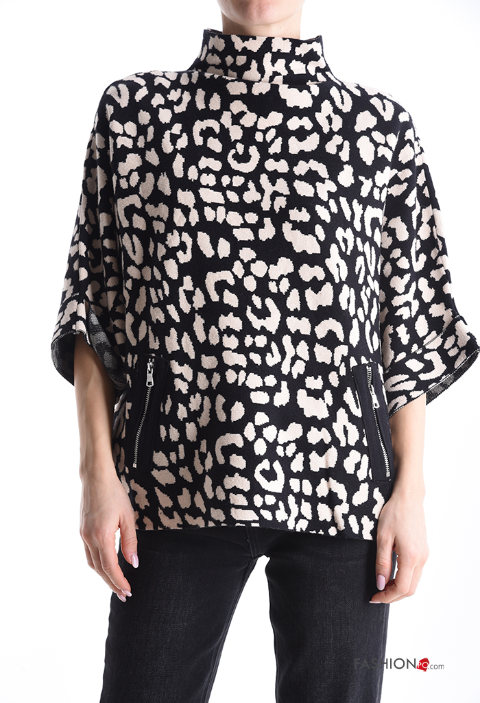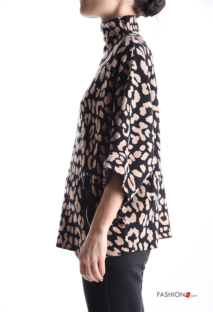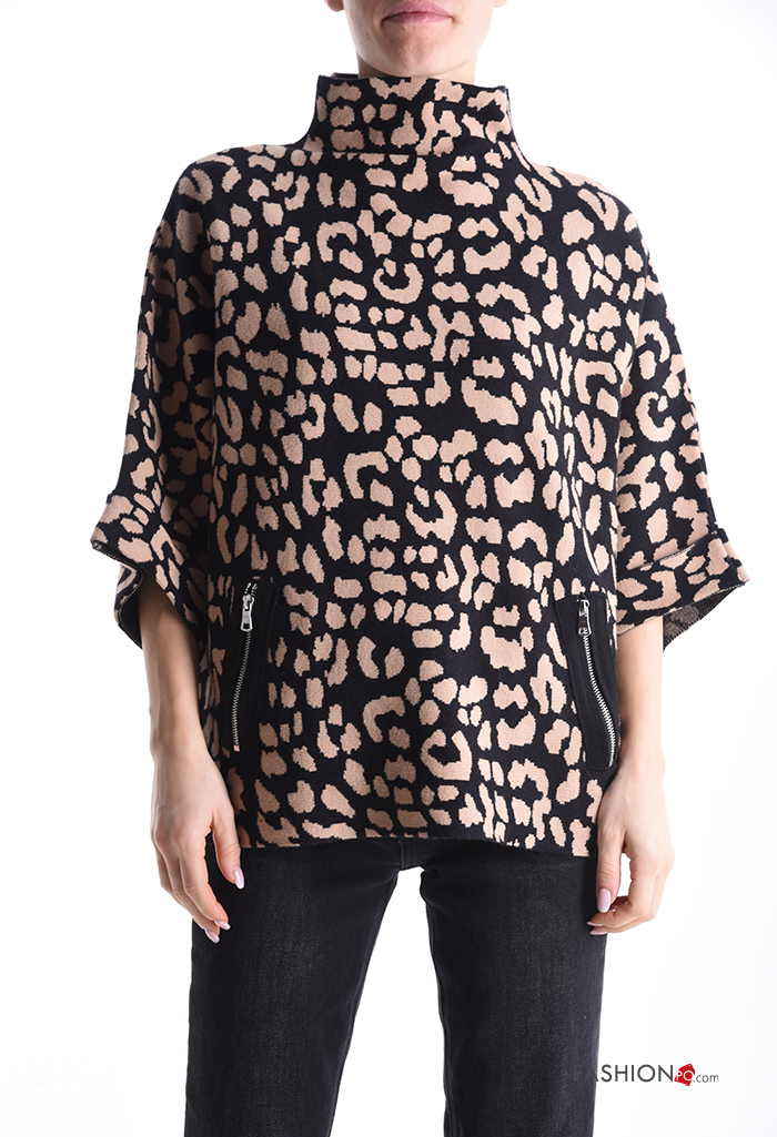 Maglione Fantasia animalier maniche a tre quarti con zip a collo alto con tasche