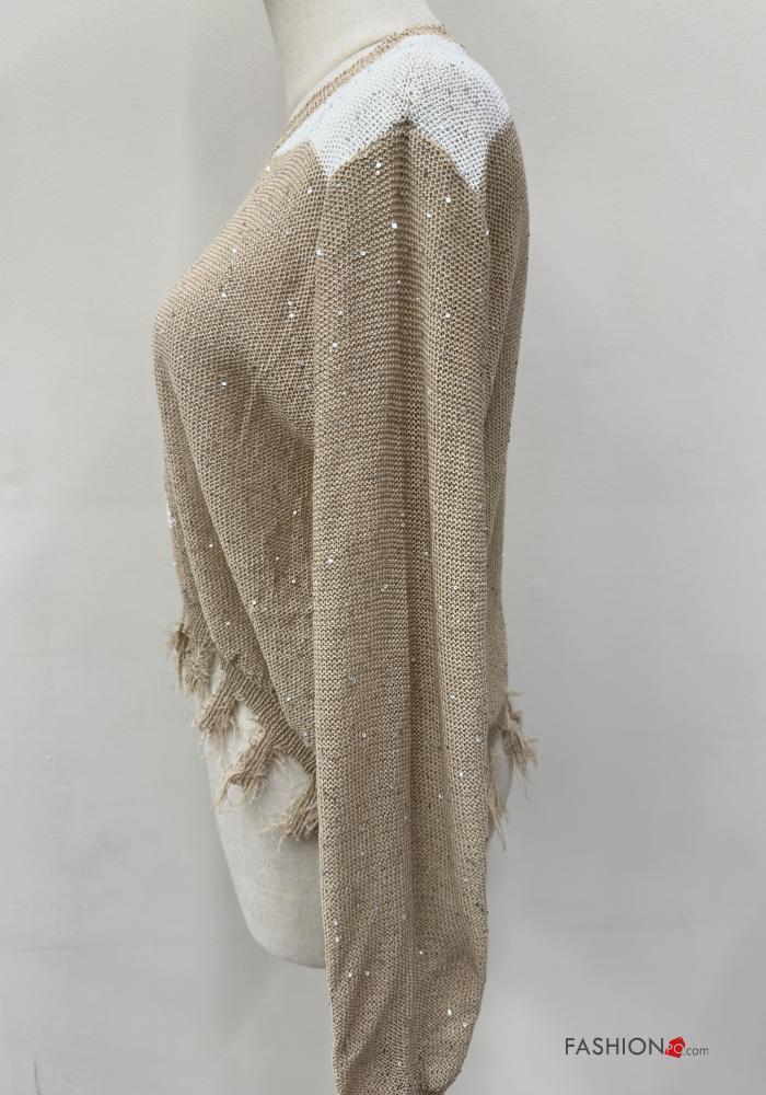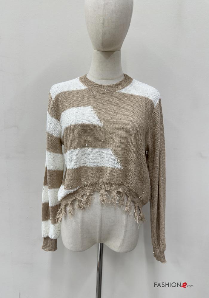 Maglione maniche lunghe girocollo Fantasia righe con strass con frange