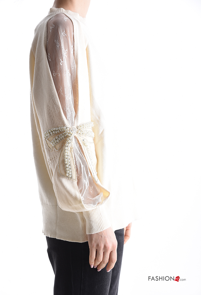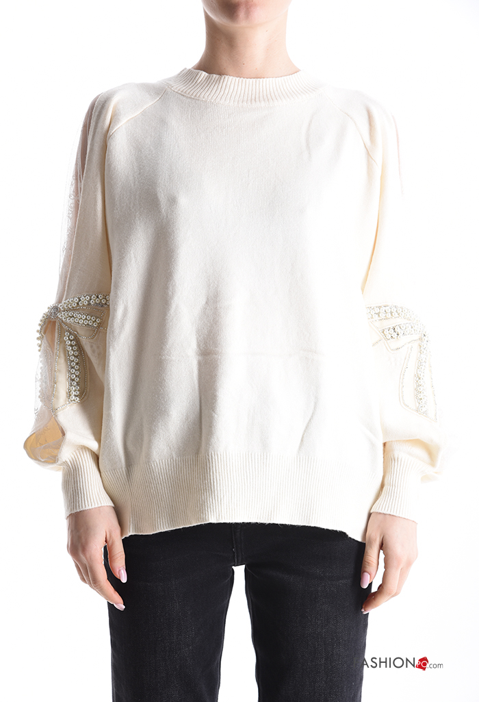 Maglione girocollo tulle maniche lunghe con perle con strass