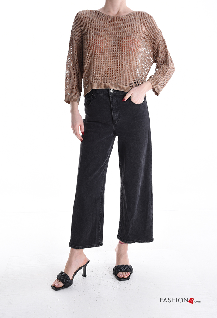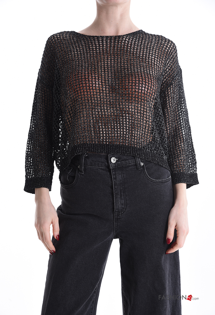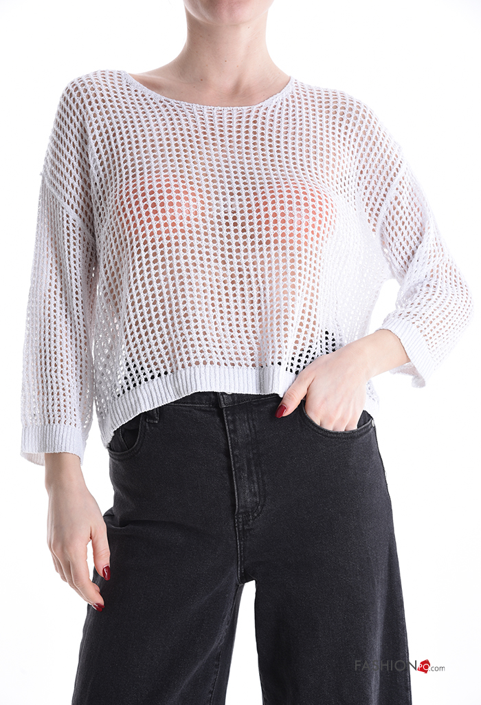 Maglione corto a rete girocollo maniche a tre quarti