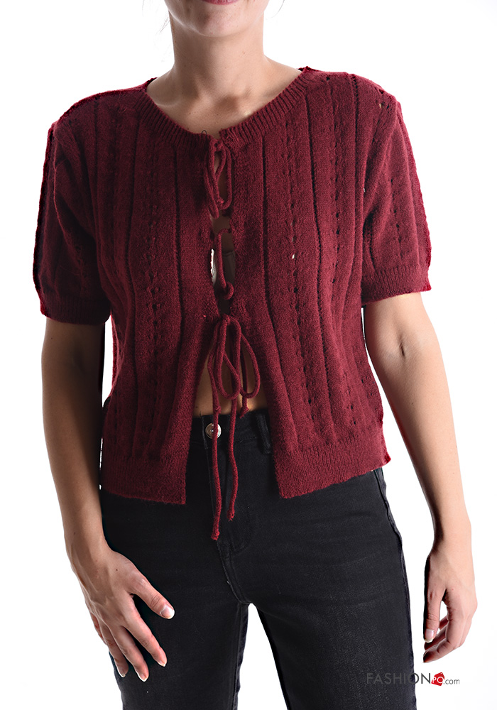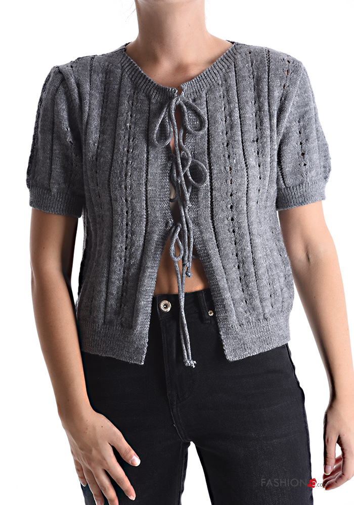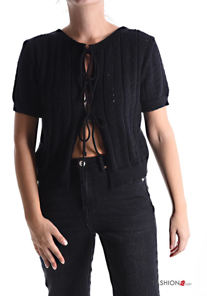 Cardigan maniche corte girocollo Fantasia ricamata con fiocco