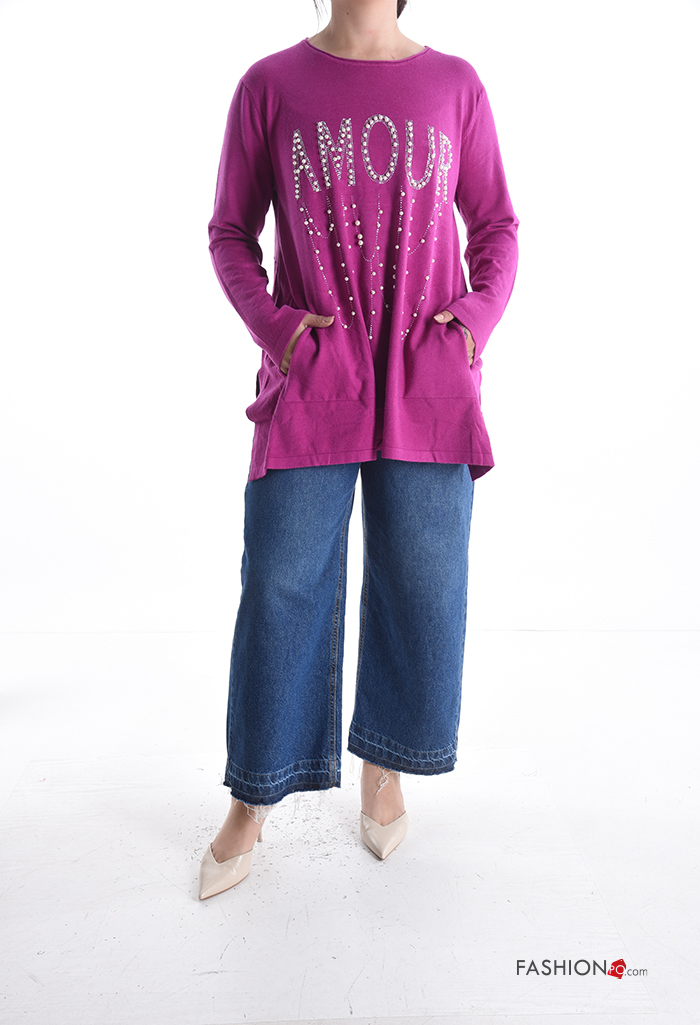Maglione maniche lunghe girocollo Fantasia scritta con spacco con borchie con tasche con strass