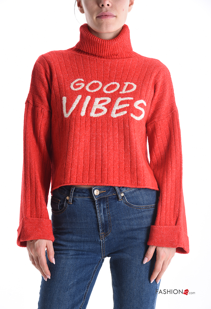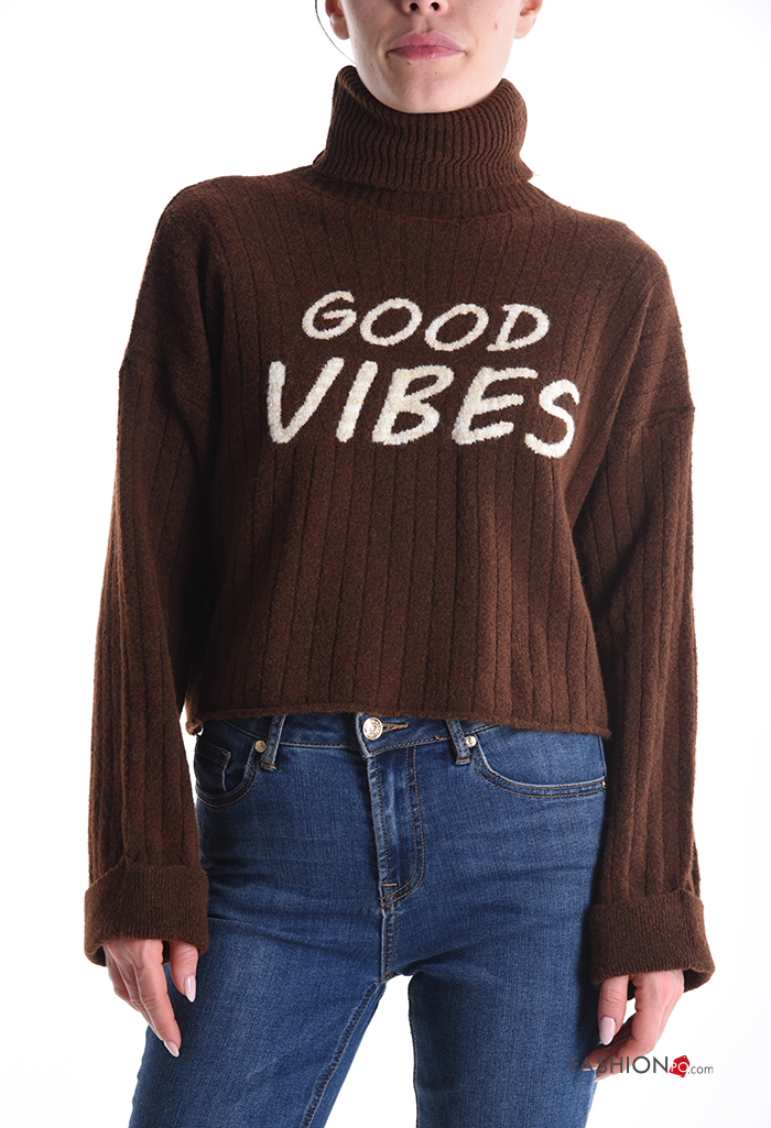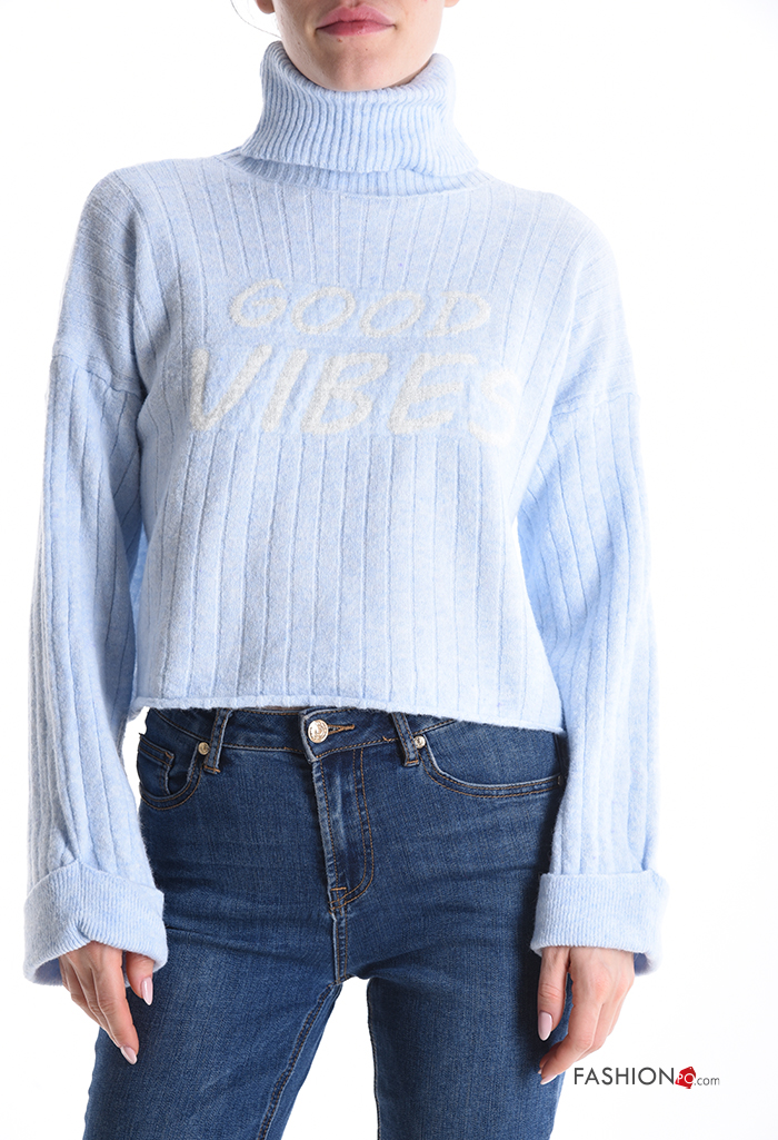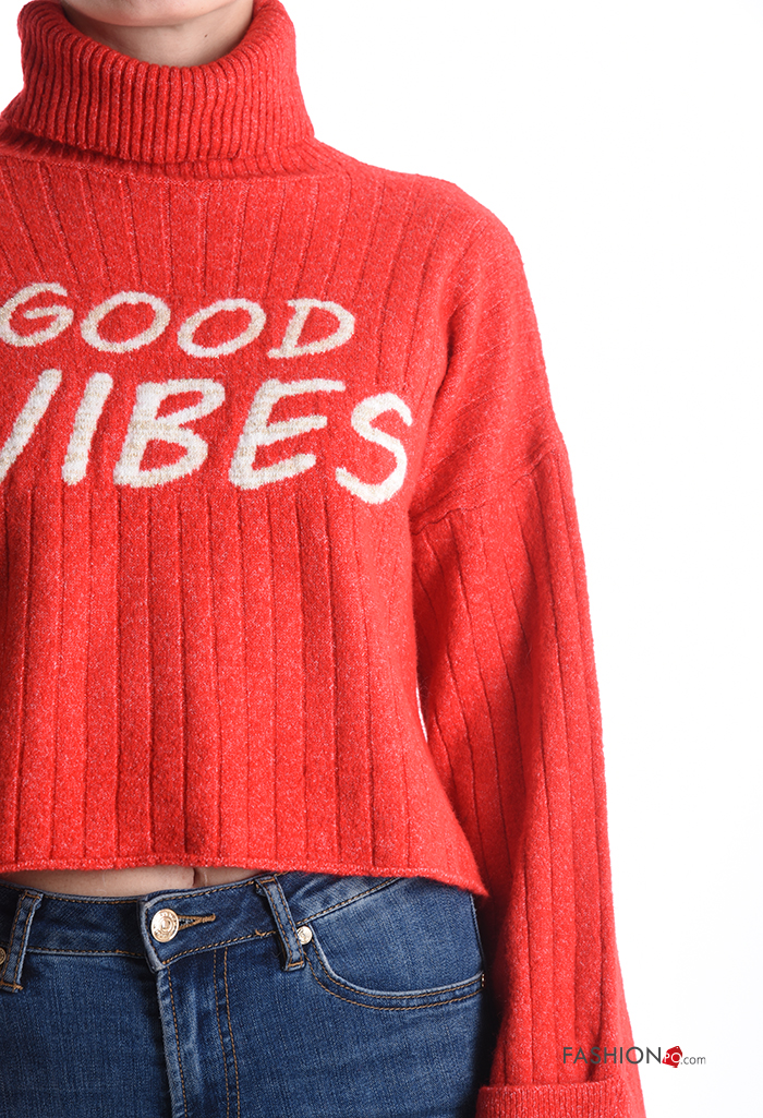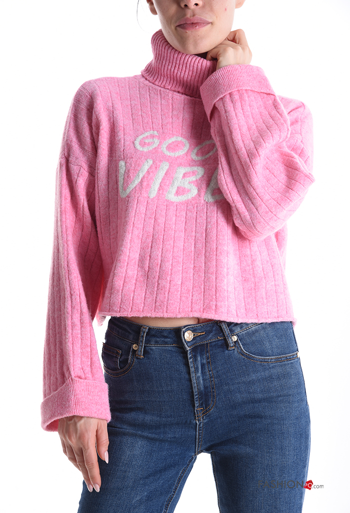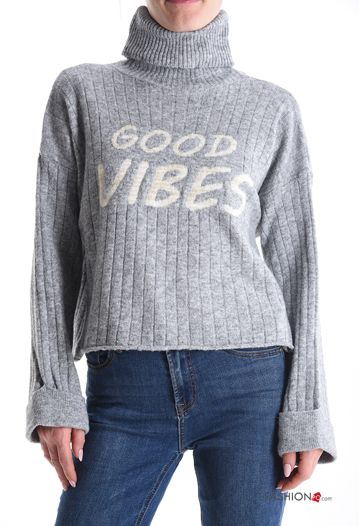 Maglione in Misto Lana costine maniche lunghe Fantasia scritta a collo alto