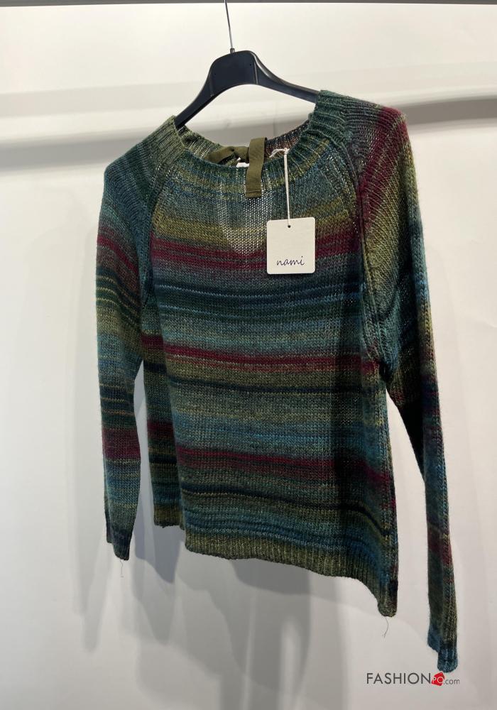 Maglione in Misto Lana scollato sulla schiena maniche lunghe girocollo Fantasia righe con fiocco