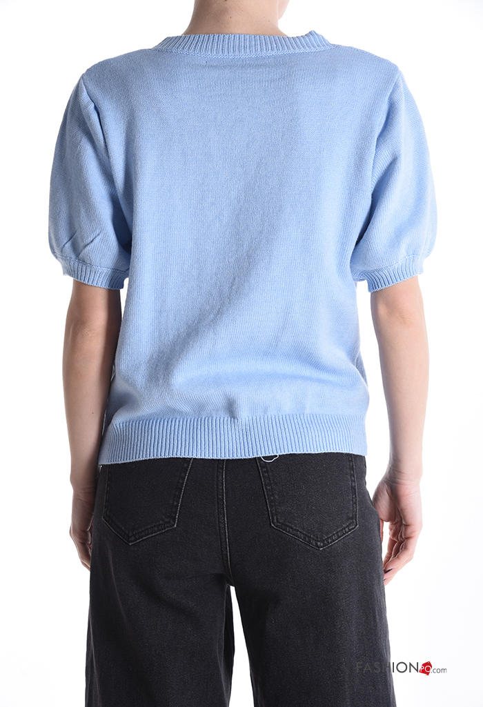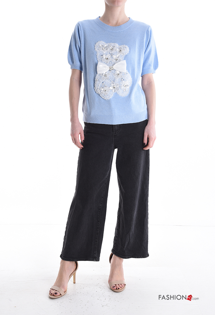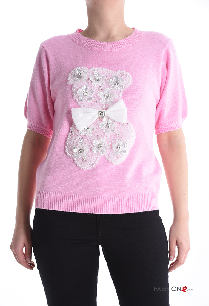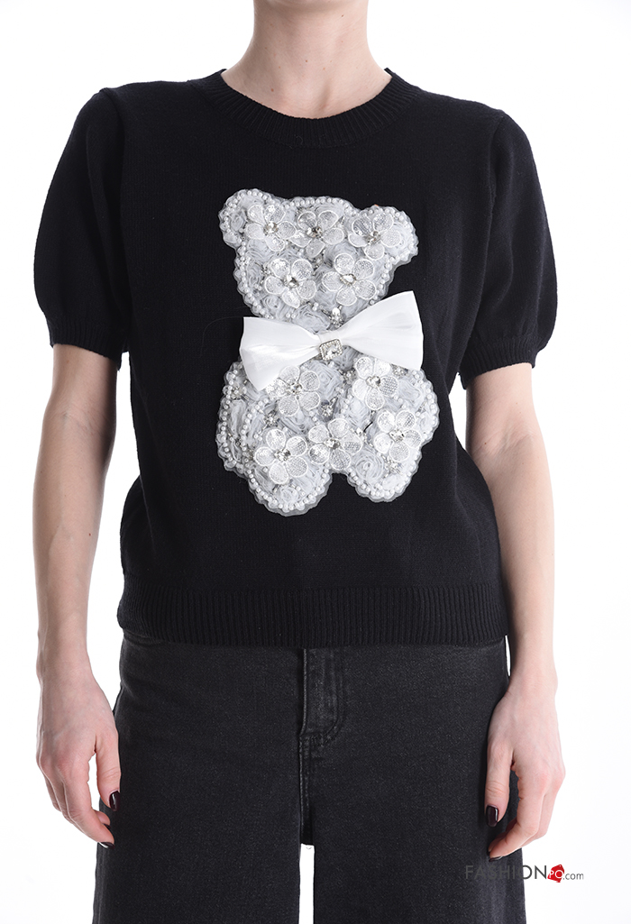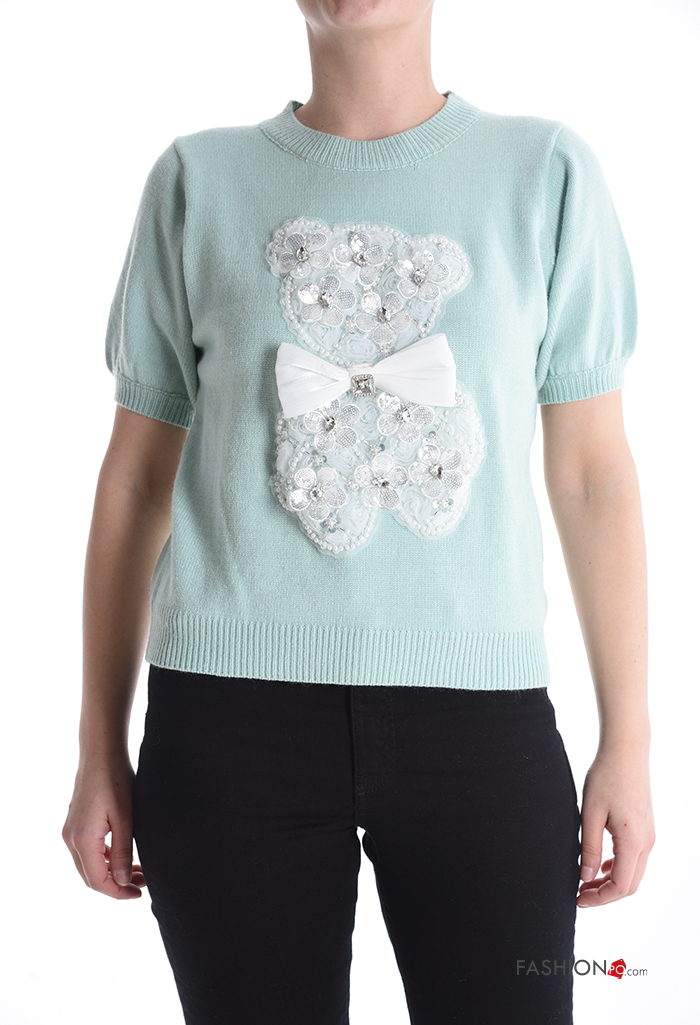 Maglione maniche corte girocollo Fantasia con peluche con strass