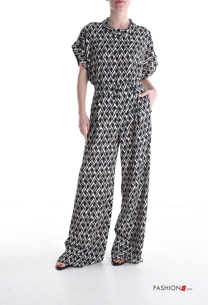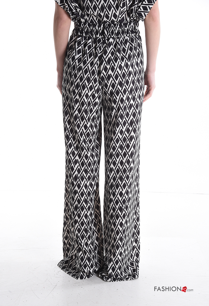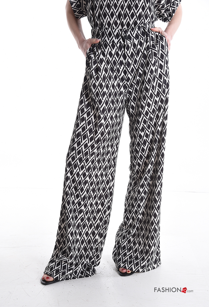 Pantalone wide leg lungo Fantasia geometrica con tasche con bottoni con zip