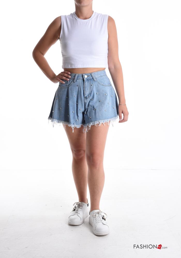 Pantaloncino Short in Cotone denim con bottoni con strass con zip con tasche
