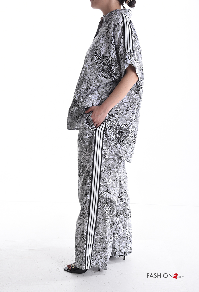 Coordinato in Cotone wide leg maniche corte con colletto Fantasia floreale con elastico con bottoni con tasche