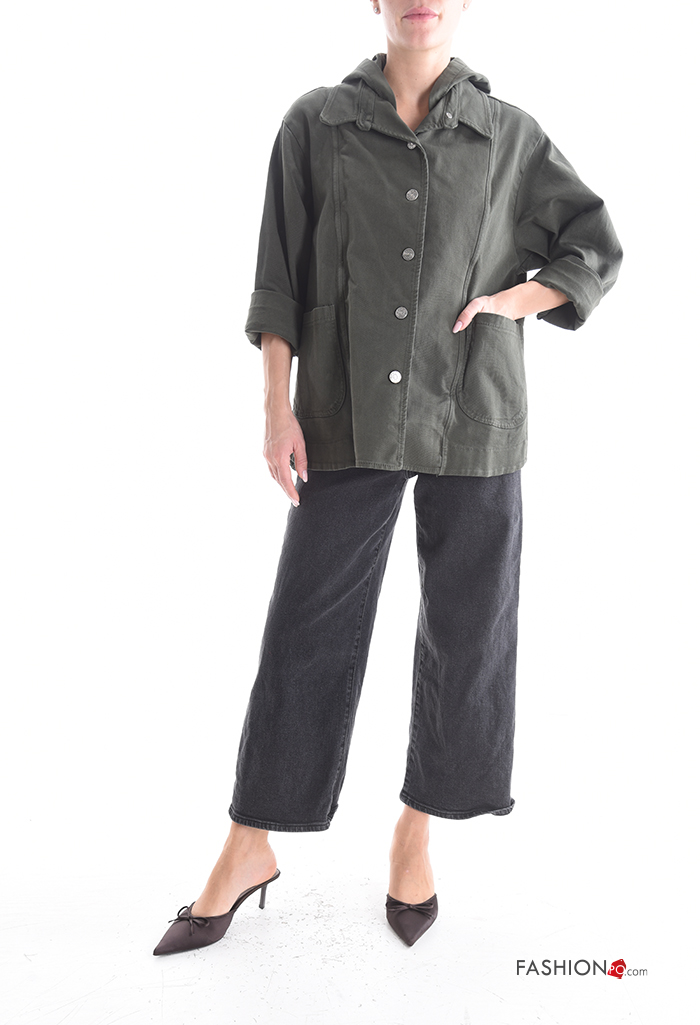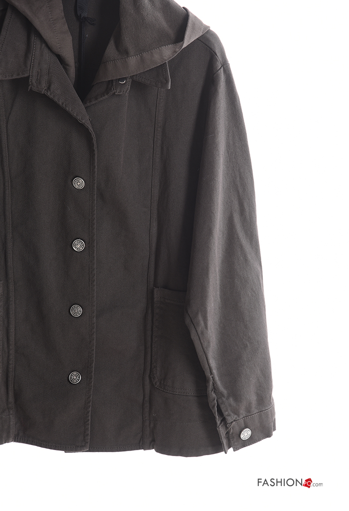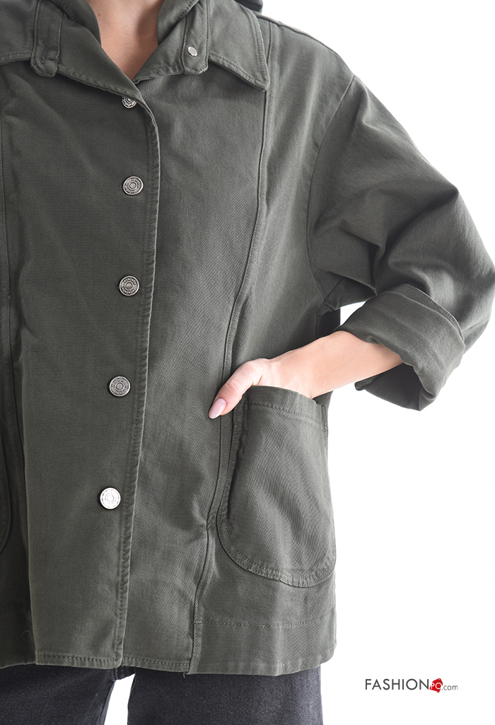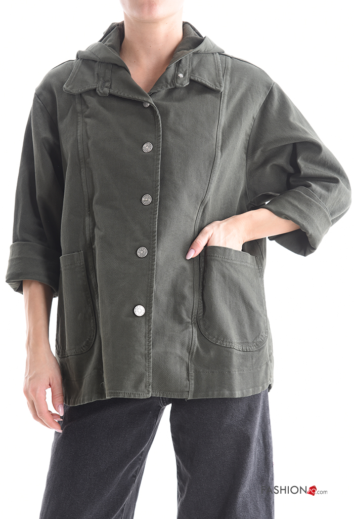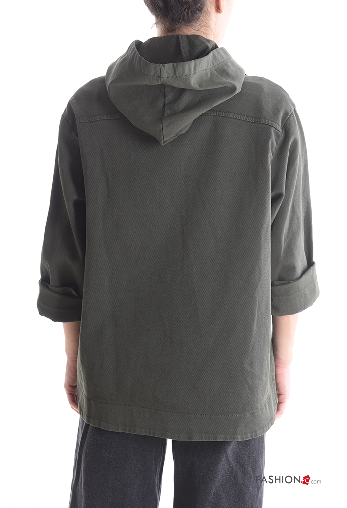 Blusão em Algodão manga comprida com gola com bolsos com botões com capuz