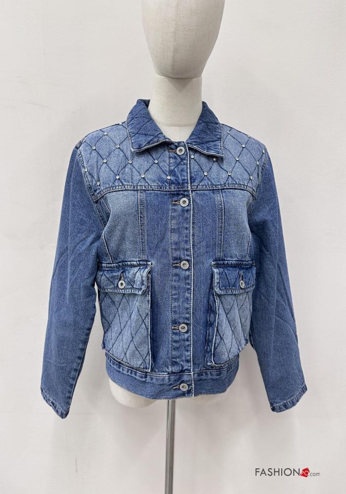Blusão em Algodão denim com gola com bolsos com botões com strass