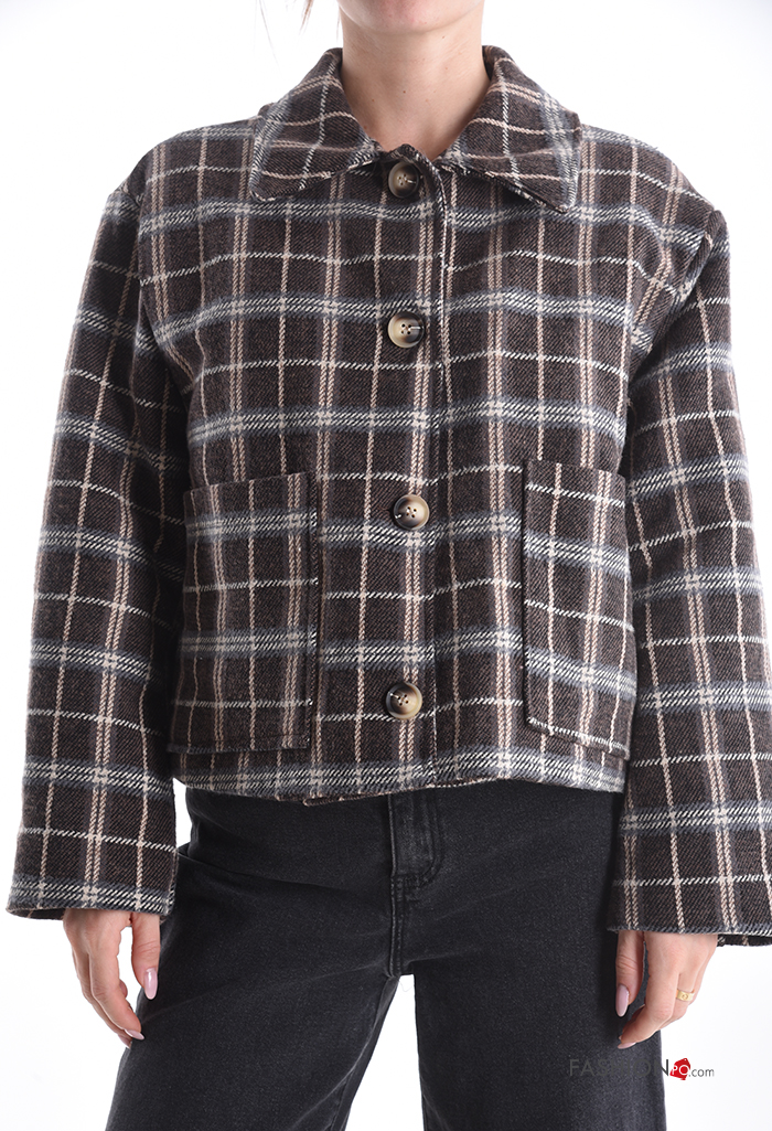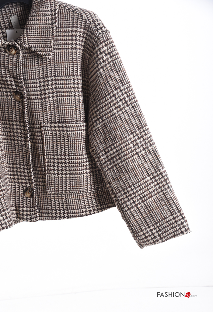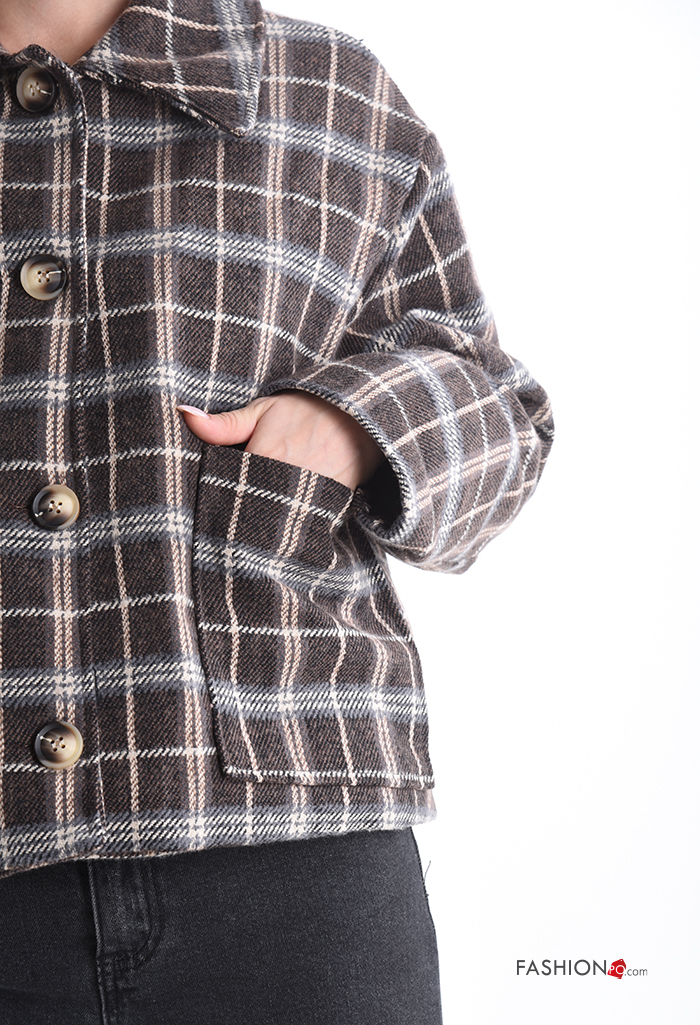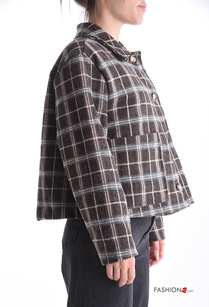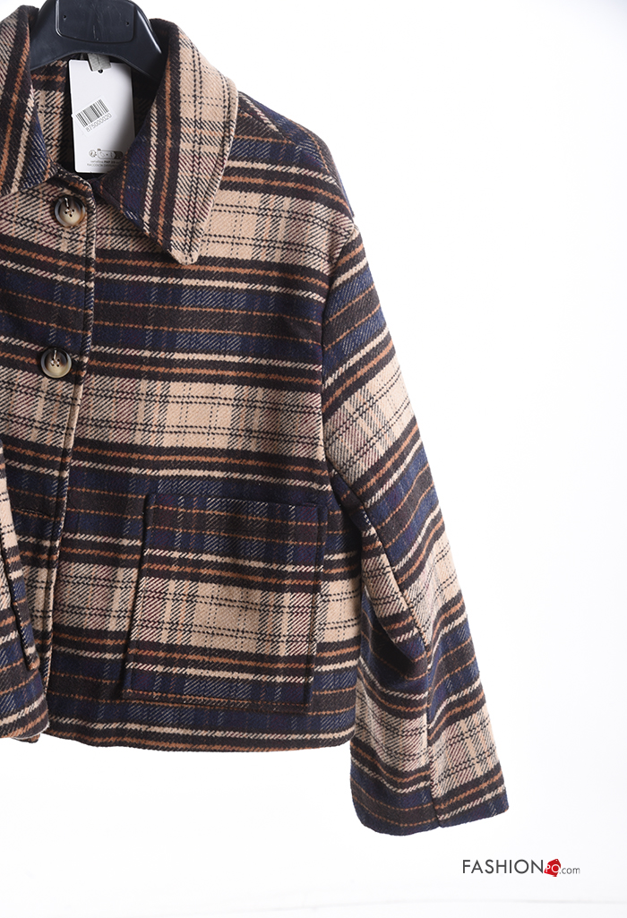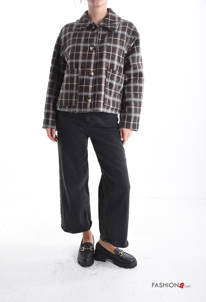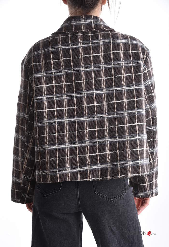 Blusão em Lã mista manga comprida com gola Padrão Tartan com botões com bolsos