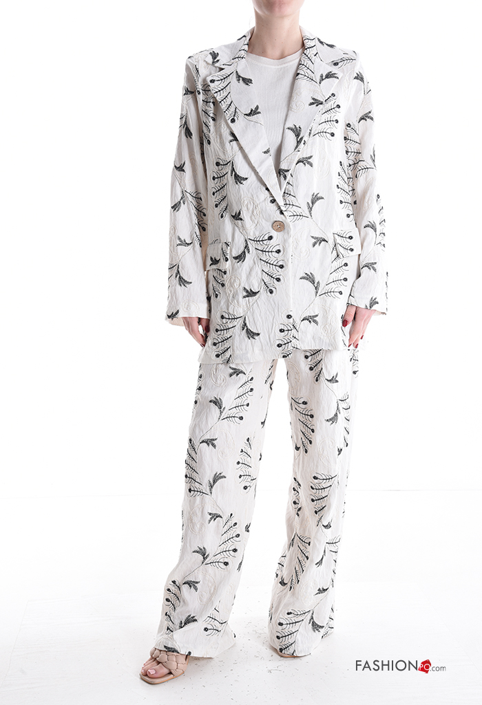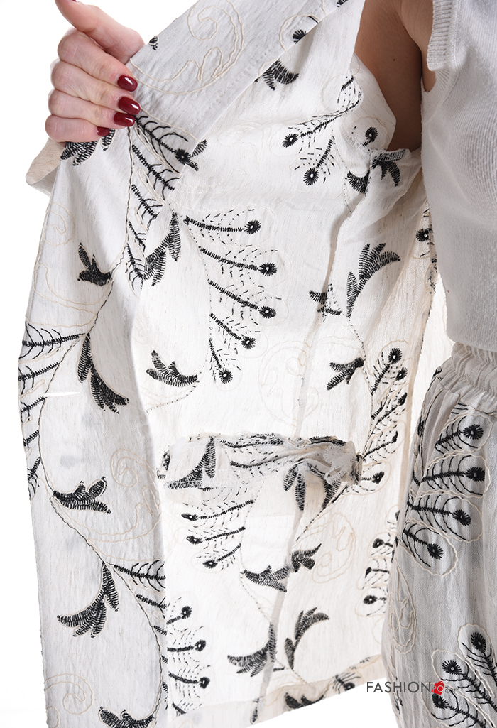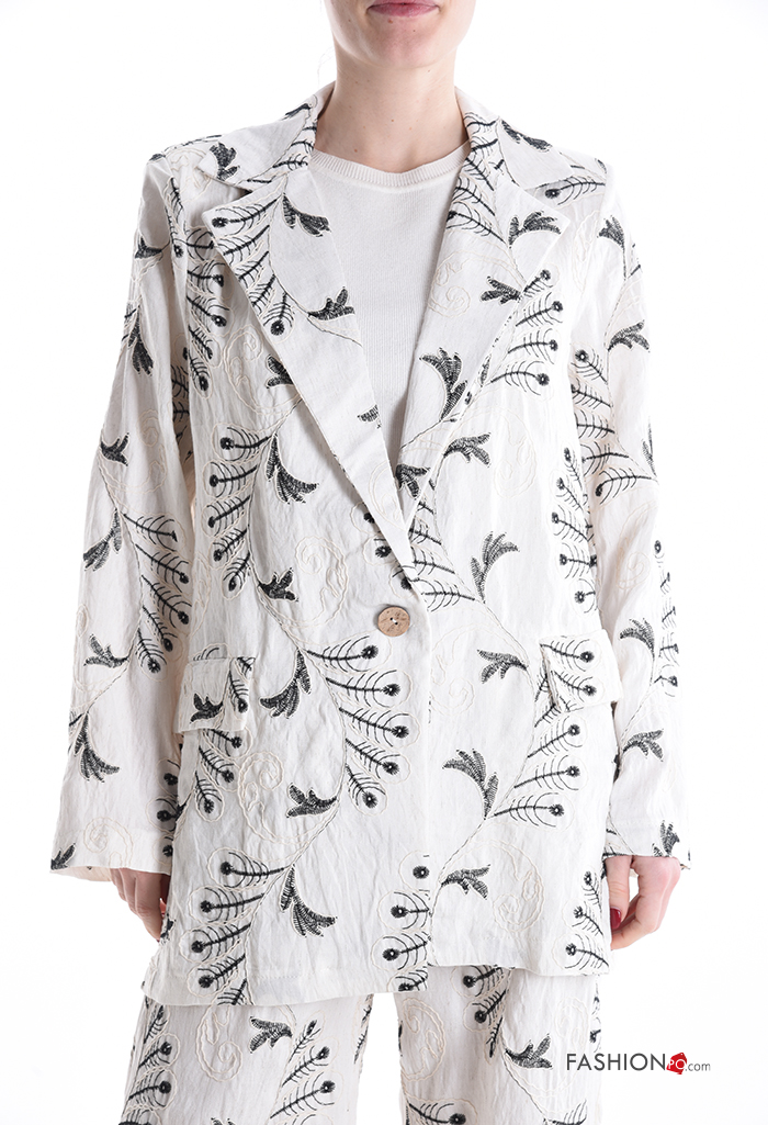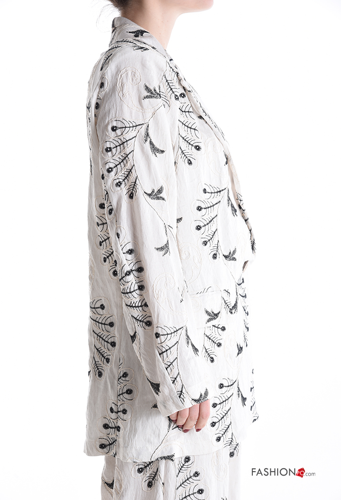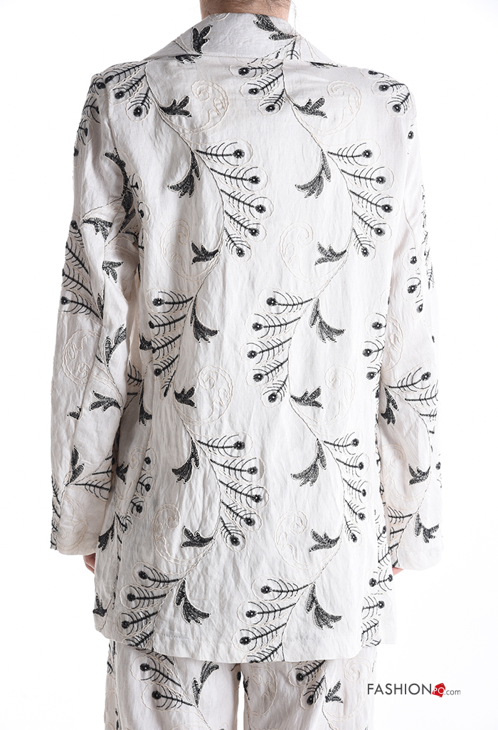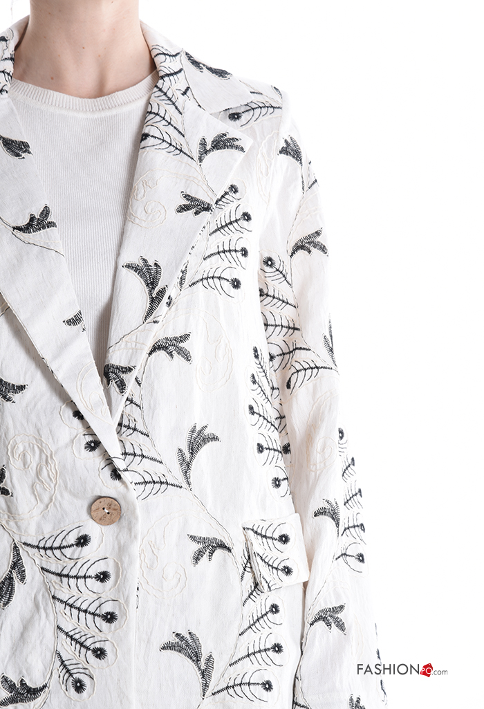 Blusão em Linho manga comprida com gola Padrão bordado com botões sem forro