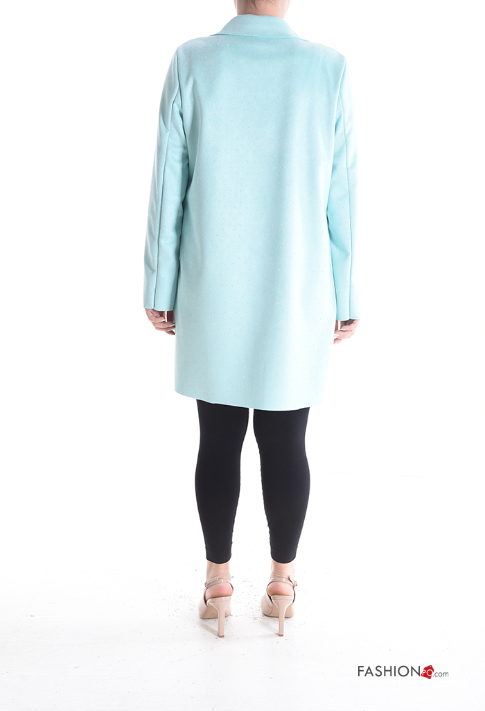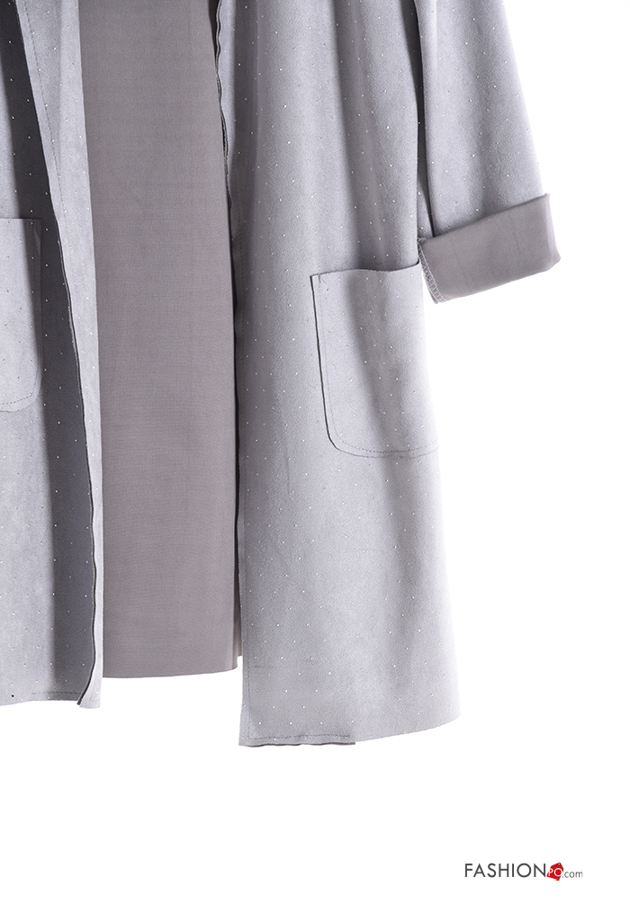 Casaco comprido camurça com gola com bolsos com strass sem forro