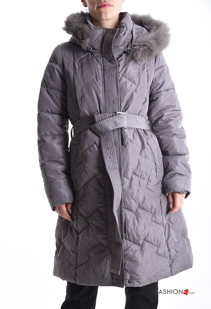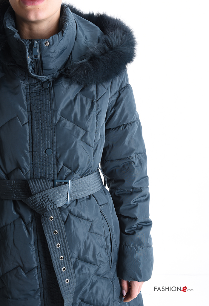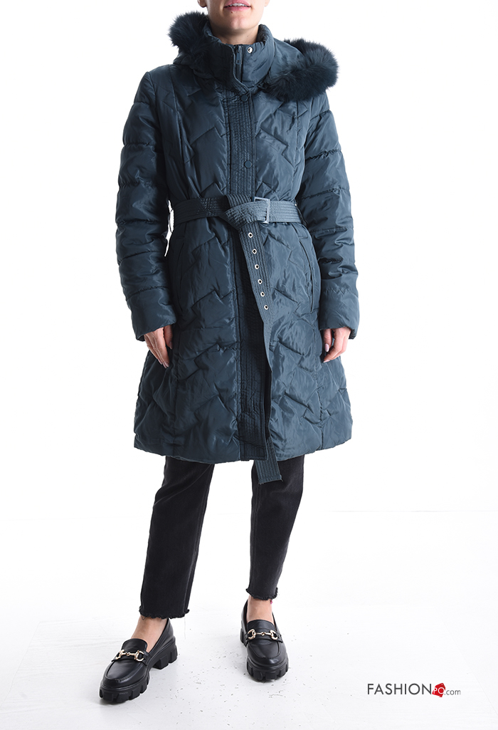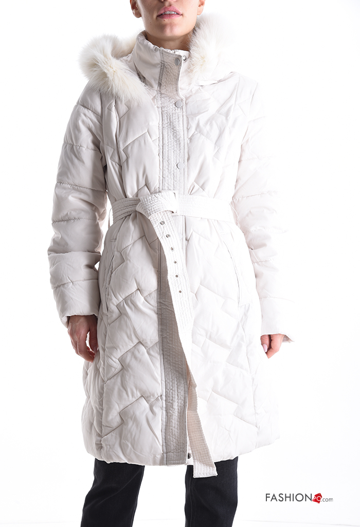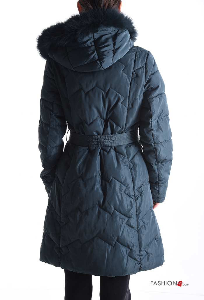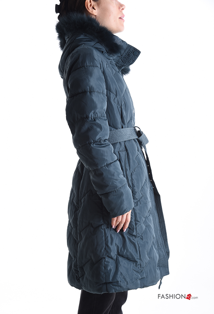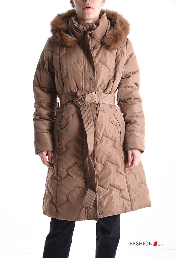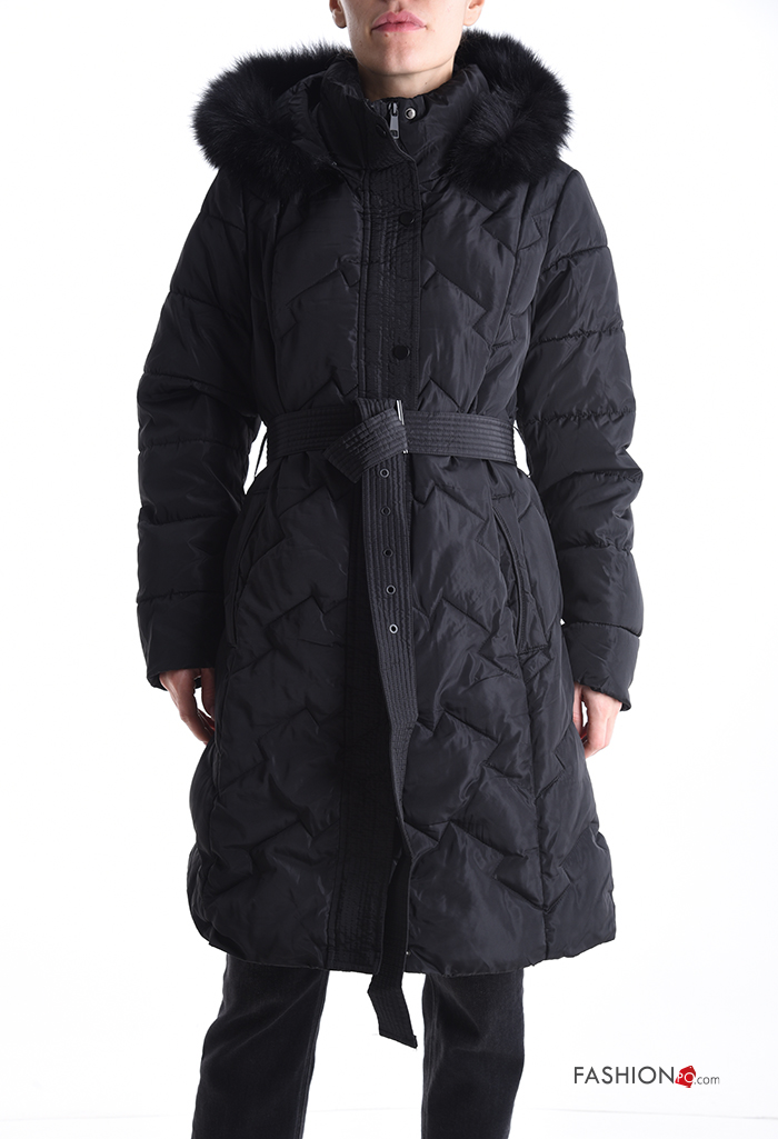 Casaco acolchoado pelo sintético com capuz com forro com fecho com bolsos com botões com cinto de tecido