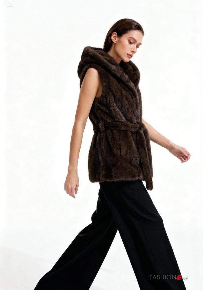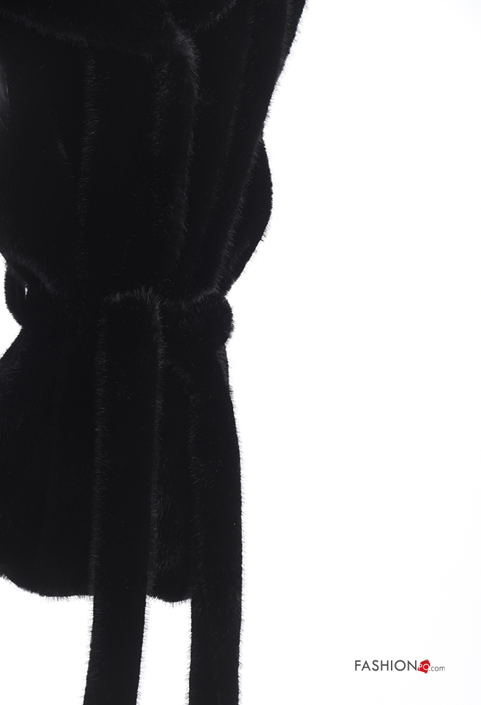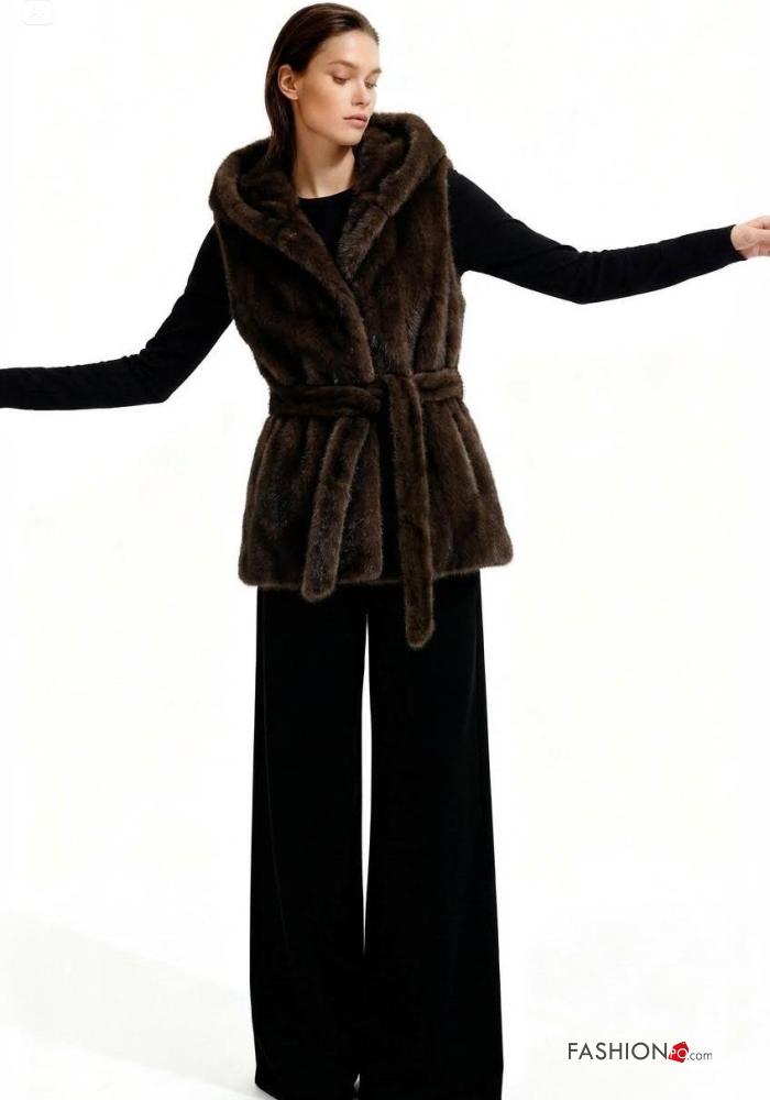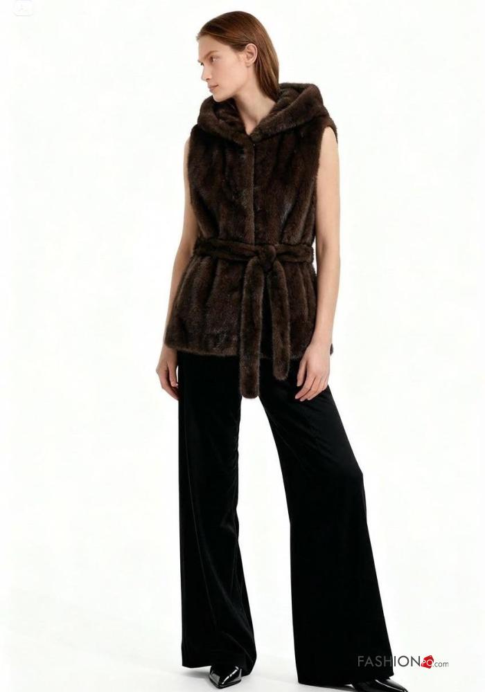 Colete pelo sintético com capuz com cinto com bolsos com botões com forro