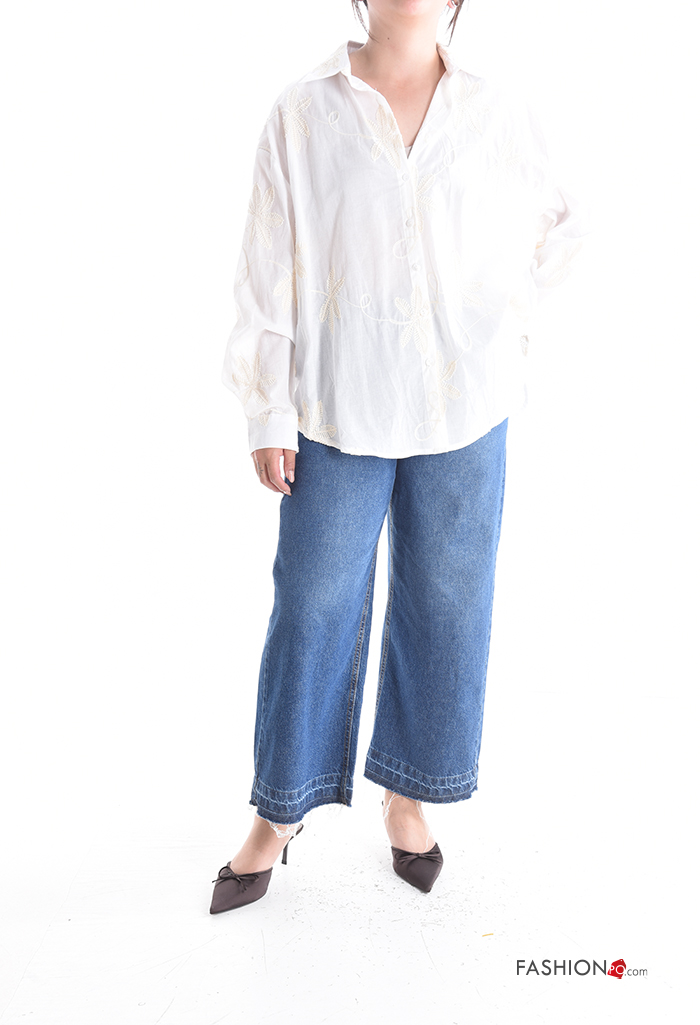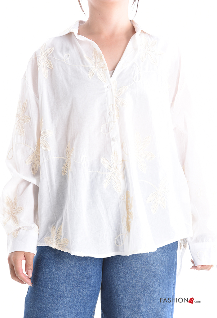 Camisa em Algodão manga comprida com gola Padrão bordado com botões
